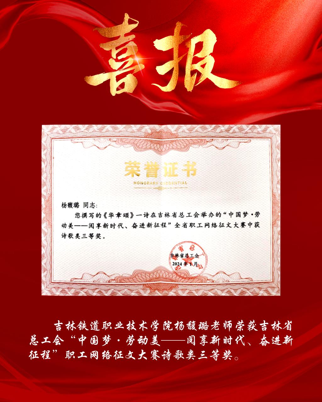 喜报丨我校教师杨馥璐荣获吉林省总工会“中国梦·劳动美——阅享新时代、奋进新征程”职工网络征文大赛散文类三等奖