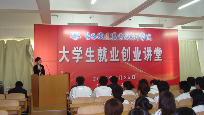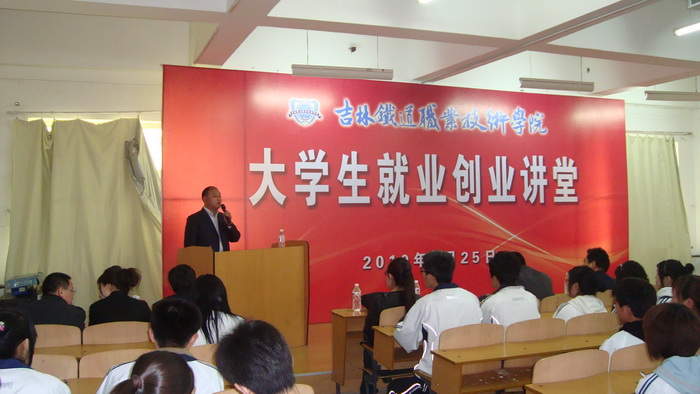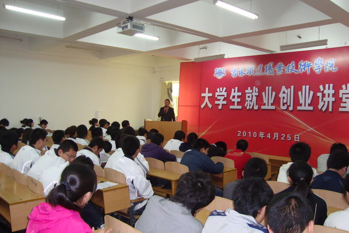 2010年4月25日,学院团委与招生就业处、学生工作处联合举办的“大学生就业创业讲堂”启动。来自长春轻轨的我院2009届毕业生李珊珊、苗壮以及吉林市宏伟商贸有限公司总经理崔宏伟走进校园,为来自各系的200余名同学们首开讲座。