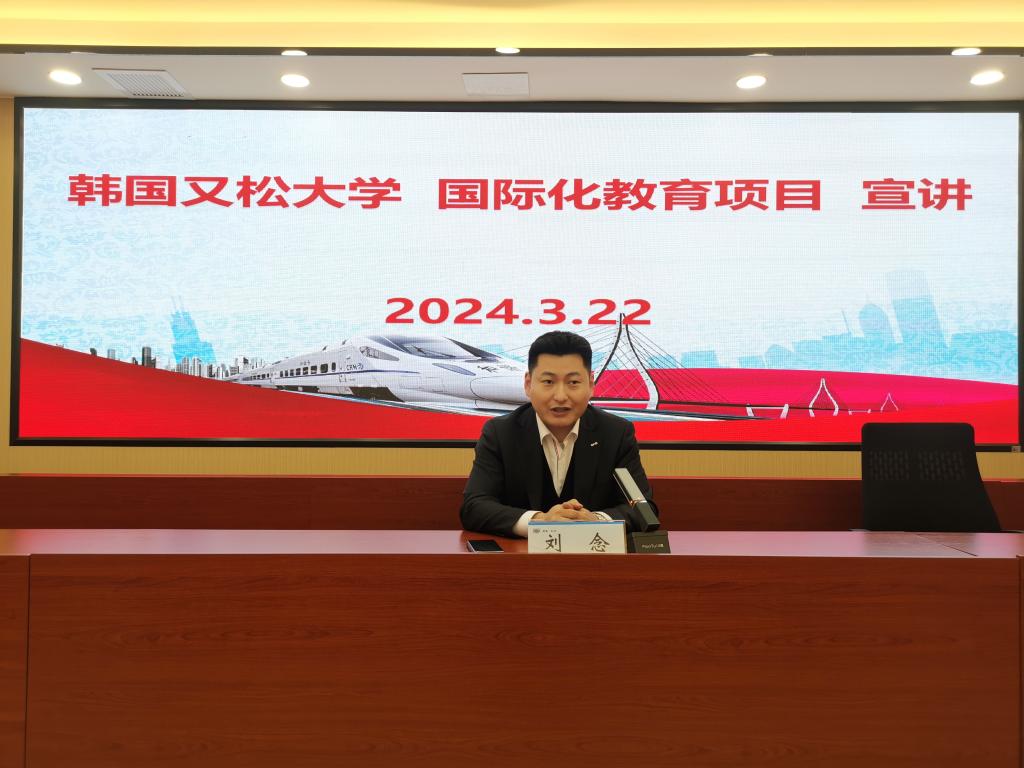 会上,曹炳志代表学校对刘念的到来表示热烈欢迎。他指出两校从2011年开始合作,2014年招生并备案获批,铁道机车运用与维护、铁道交通运营管理两个合作办学项目平稳顺利运行,双方精诚合作十年来,学校成为吉林省高职院校国际化办学的火车头和引领者,所取得的成就离不开韩国又松大学的支持。他表示,教育部提出稳步推进“职教出海”,全国不同省份开展的鲁班工坊、丝路学院、郑和学院、墨子学院等职教品牌不断发展,有力推进了我国“职教出海”的步伐。学校坚定不移贯彻落实习近平总书记关于“一带一路”建设重要讲话精神,希望通过与韩国又松大学共同筹建中韩天佑学院,打造吉林省“职教出海”品牌,进一步提升学校国际化办学水平,为建设向北开放重要窗口和东北亚地区合作中心枢纽提供人才支撑。