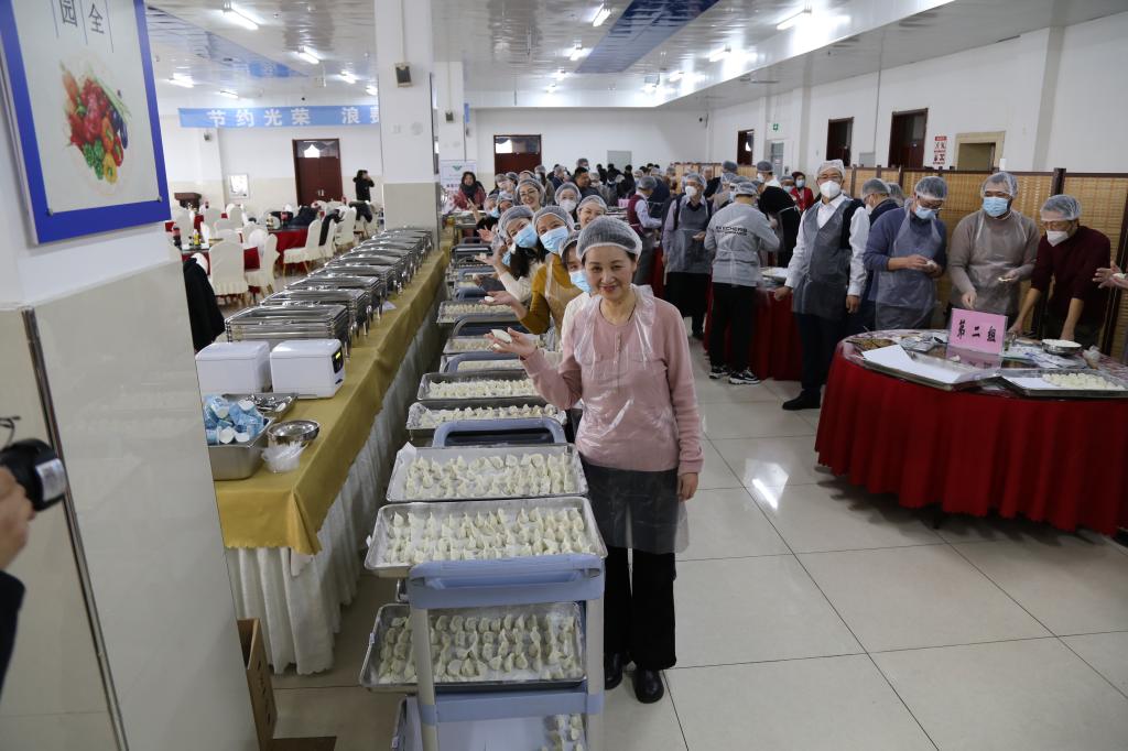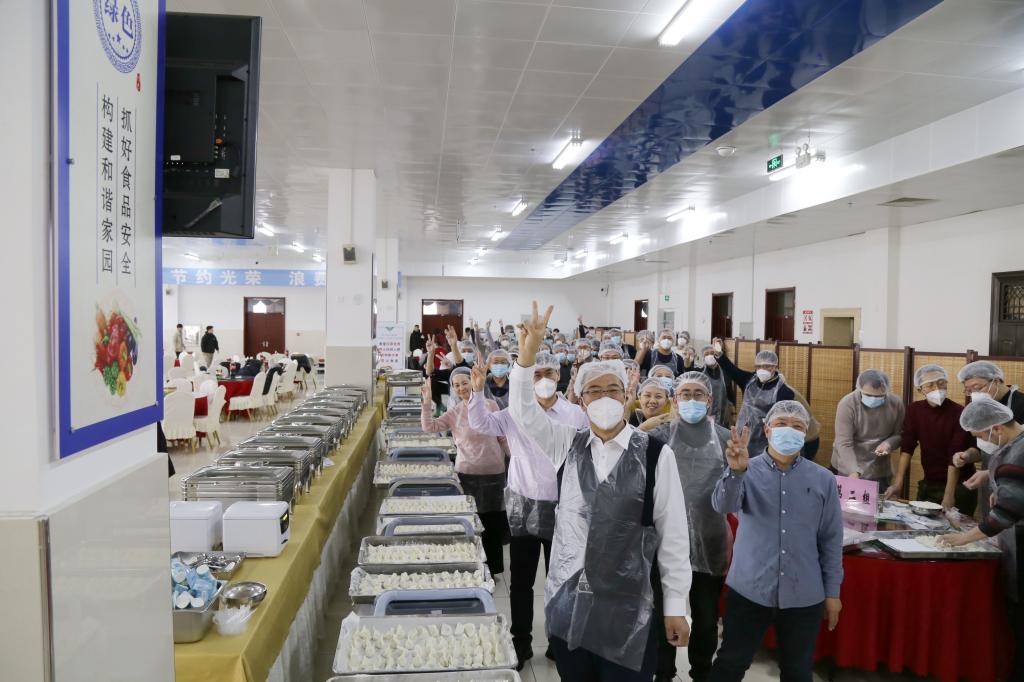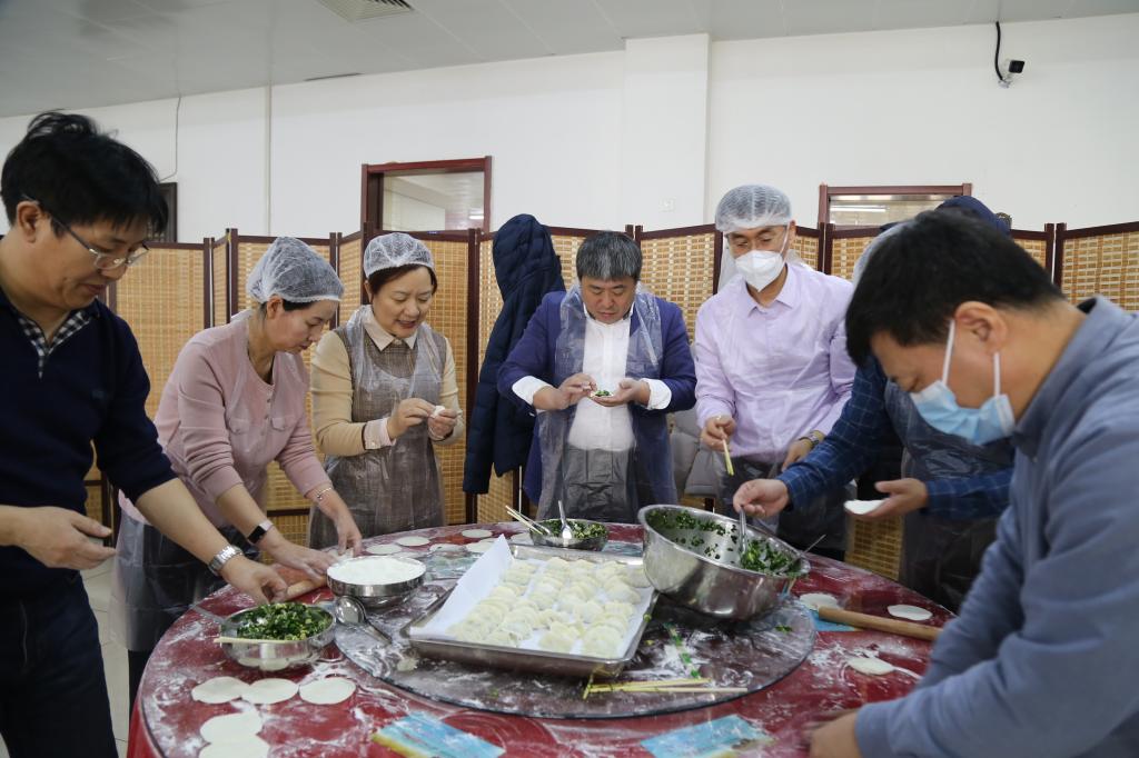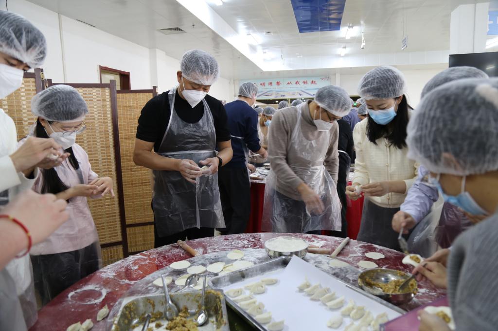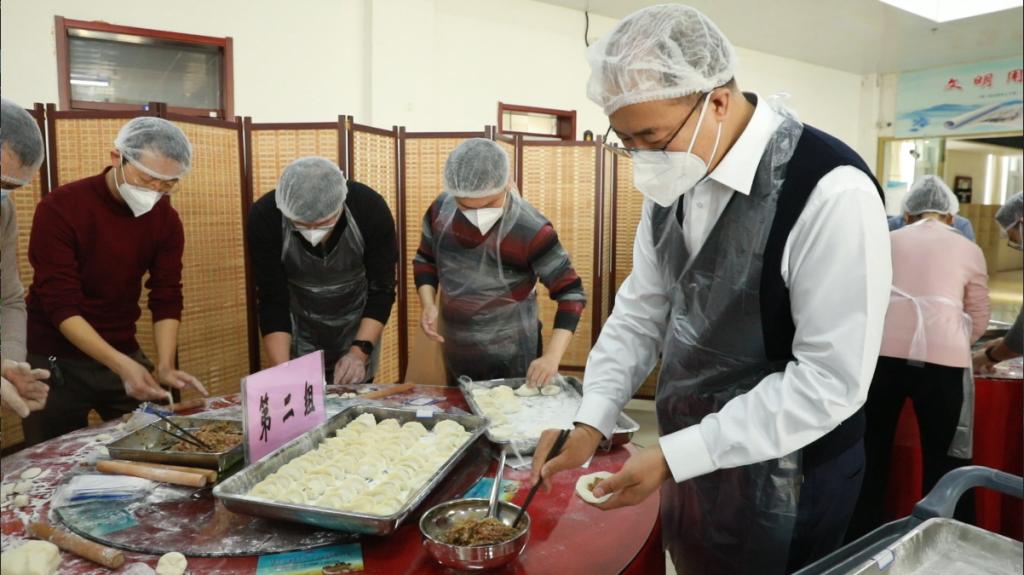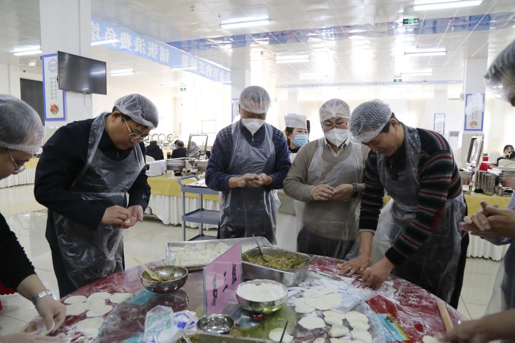 学校后勤管理服务中心早已备好了面团馅料,学校六位男领导各带一组男教职工系上围裙,围在一起,揉面、揪团、擀皮、拌馅,人人参与,大展身手。