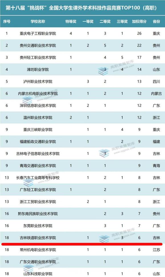 我校高度重视并积极组织筹备。发动全校师生积极参加报名,此次大赛收到全校118多份作品,千余名师生参与大赛。经过校赛、省赛评选推荐,国赛比拼,最终荣获国家级一等奖1项,三等奖3项,在获奖等级和数量上均取得重大突破。按照获奖情况加权得分计算,在第十八届“挑战杯”全国大学生课外学术科技作品竞赛TOP100(高职)排名中排全国第18名,吉林省第3名。