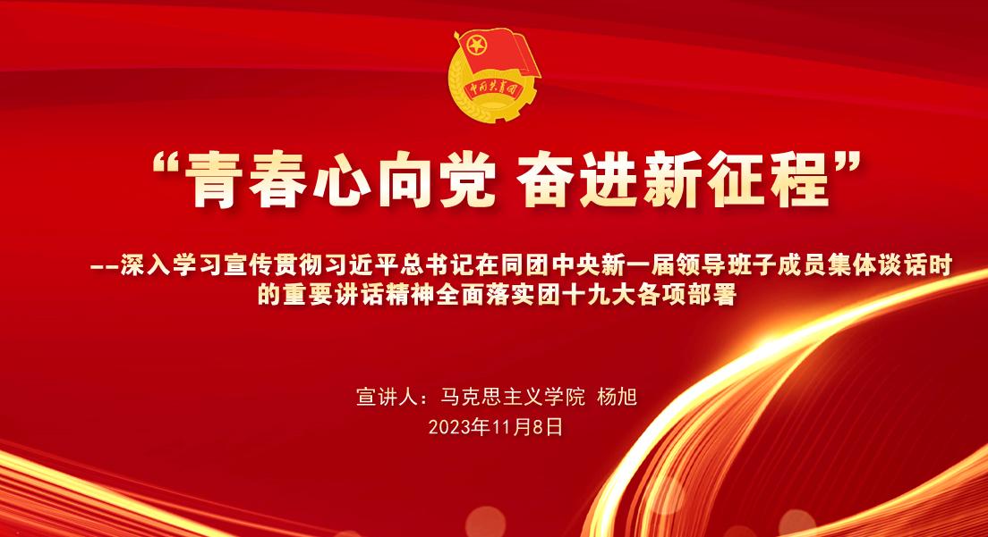 为深入学习贯彻习近平总书记在同团中央新一届领导班子成员集体谈话时的重要讲话精神,深刻领会党中央致词精神,全面落实团十九大各项部署,我校于10月和11月份集中开展2023年下半年团校培训班暨“青春心向党 奋进新征程”主题宣讲活动。学校团委邀请共青团吉林市委“青年宣讲团”成员---我校马克思主义学院杨旭、王莹、朱冬琦三位优秀青年教师,分别面向入团积极分子、团学干部和青马工程学员等1500余名学生开展宣讲活动。
