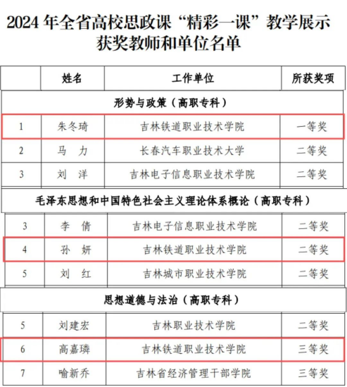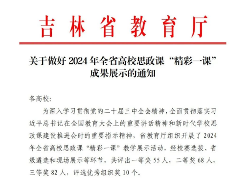 11月22日,由吉林省教育厅主办的2024年全省高校思政课“精彩一课”教学展示活动圆满结束。我校思政课教师朱冬琦荣获“形势与政策”课程组一等奖,孙妍荣获“毛泽东思想和中国特色社会主义理论体系概论”课程组二等奖,高嘉璘荣获“思想道德与法治”课程组三等奖。