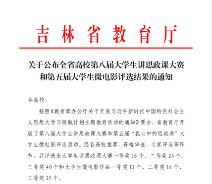 11月29日,吉林省教育厅公布了第八届大学生讲思政课大赛和第五届“我心中的思政课”大学生微电影评选活动结果。我校思政课教师带领的学生团队在此次比赛中表现优异,共荣获大学生讲思政课大赛一等奖2个、二等奖2个、三等奖2个;在大学生微电影评选中,长视频组获得一等奖1个、二等奖1个。