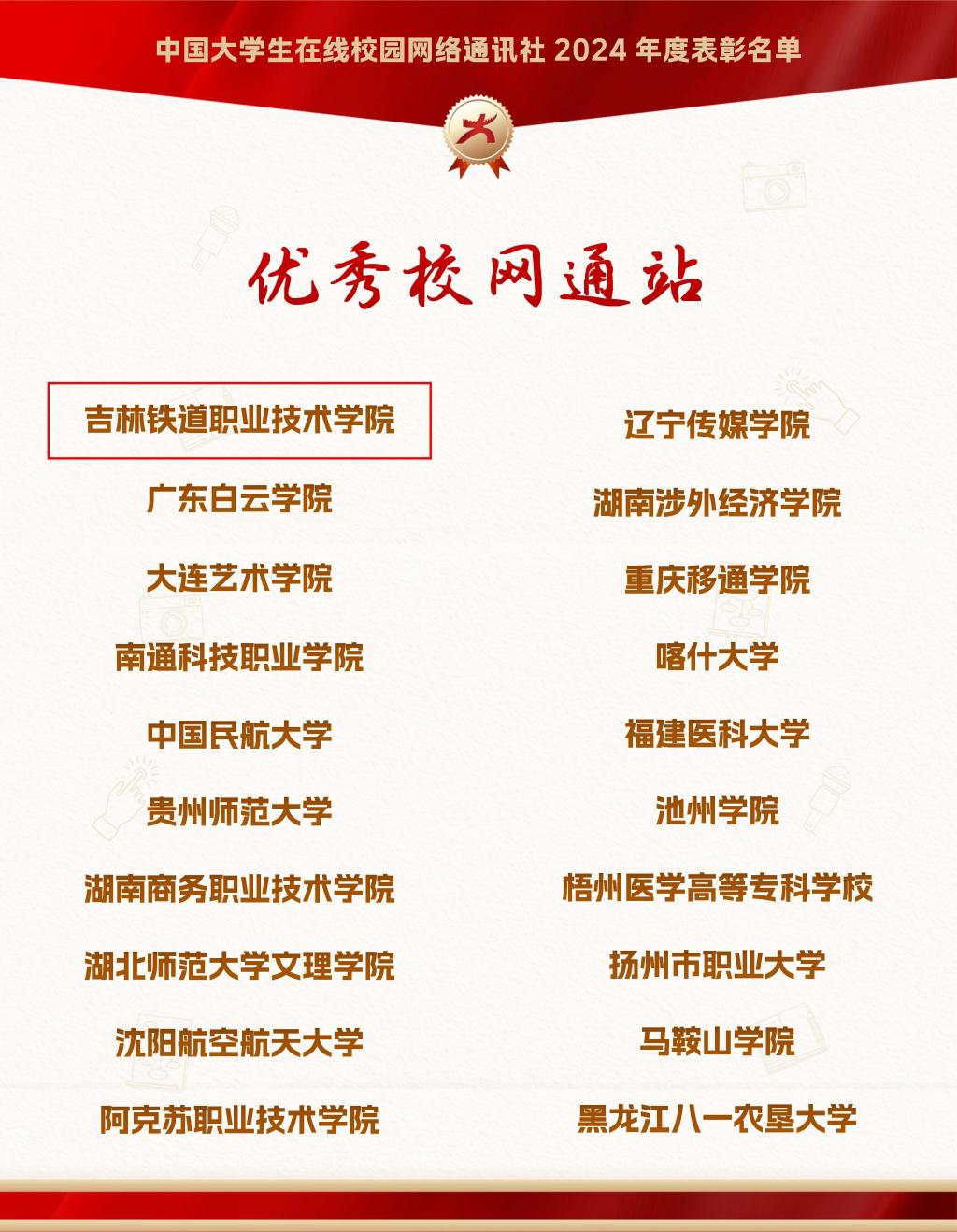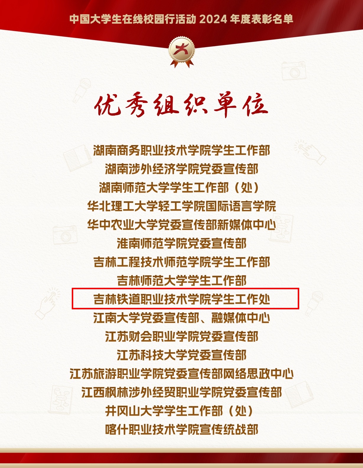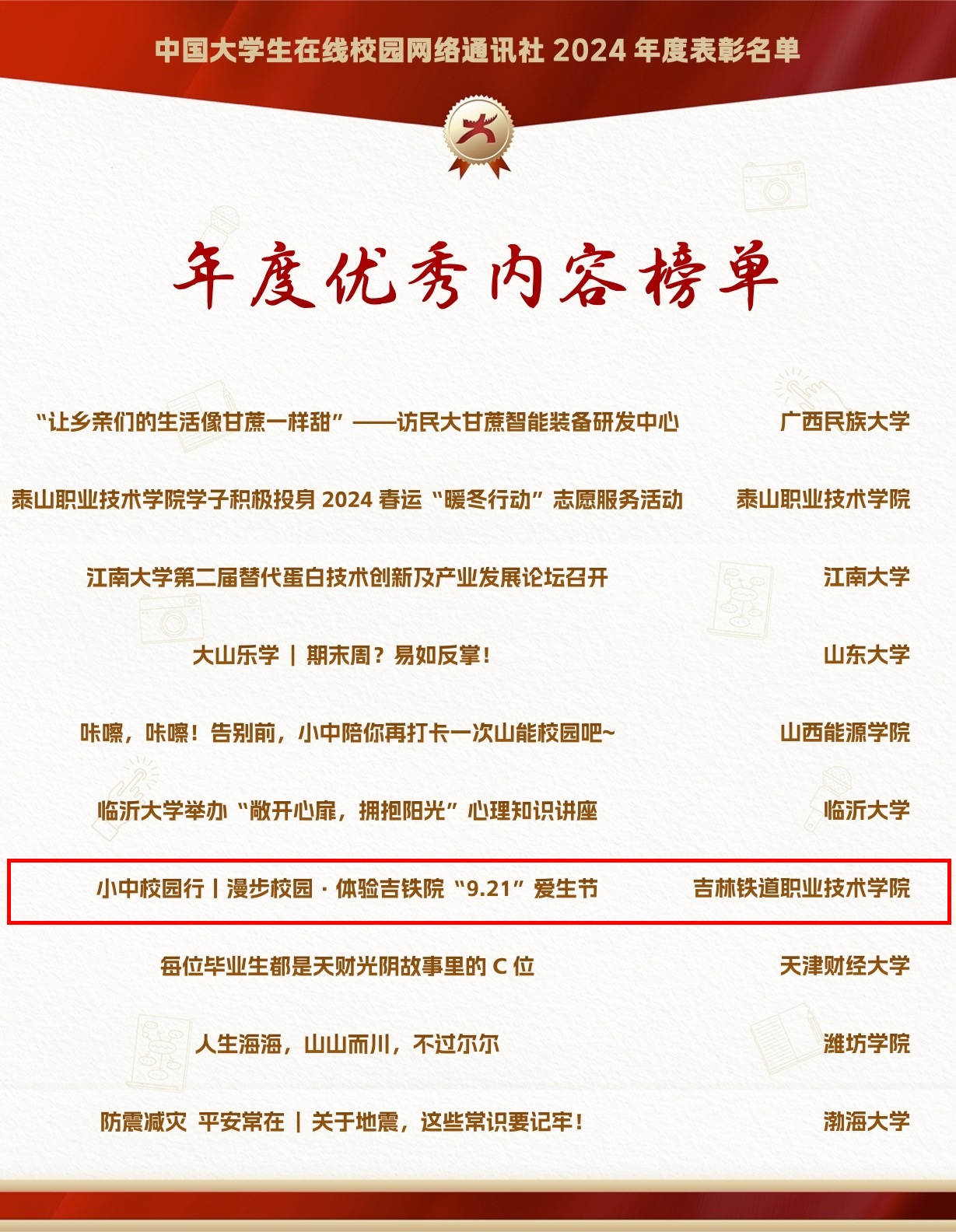 近日,2024年度教育部中国大学生在线校网通及校园行表彰榜单新鲜出炉,我校六个项目在评选中喜获佳绩,学校获评“优秀校网通站”、学生工作处获评“校园行活动优秀组织单位”、学生工作处李爽获评“校网通优秀指导教师”和“校园行新星指导教师”、高铁综合技术学院赵轩同学获评“优秀学生编辑”,“小中校园行|漫步校园·体验吉铁院9·21爱生节”获评“优秀年度内容榜单”。“吉林铁道职业技术学院学工在线”连续六周排名中国大学生在线校园号热度榜高职高专榜单第一,发布的校园行活动内容多次推送到中国大学生在线首页。