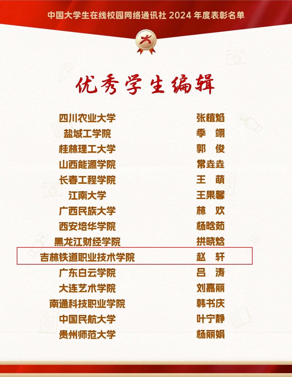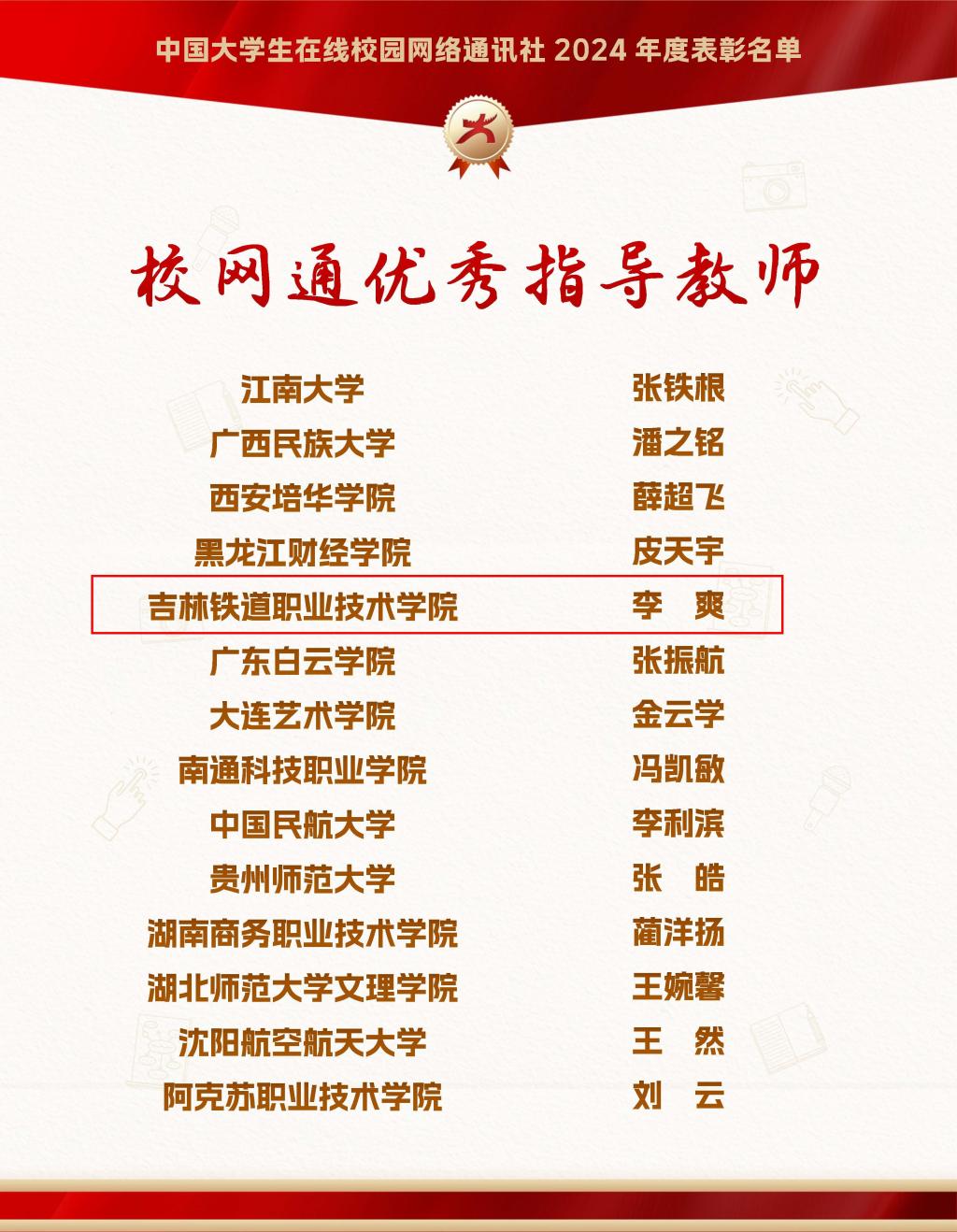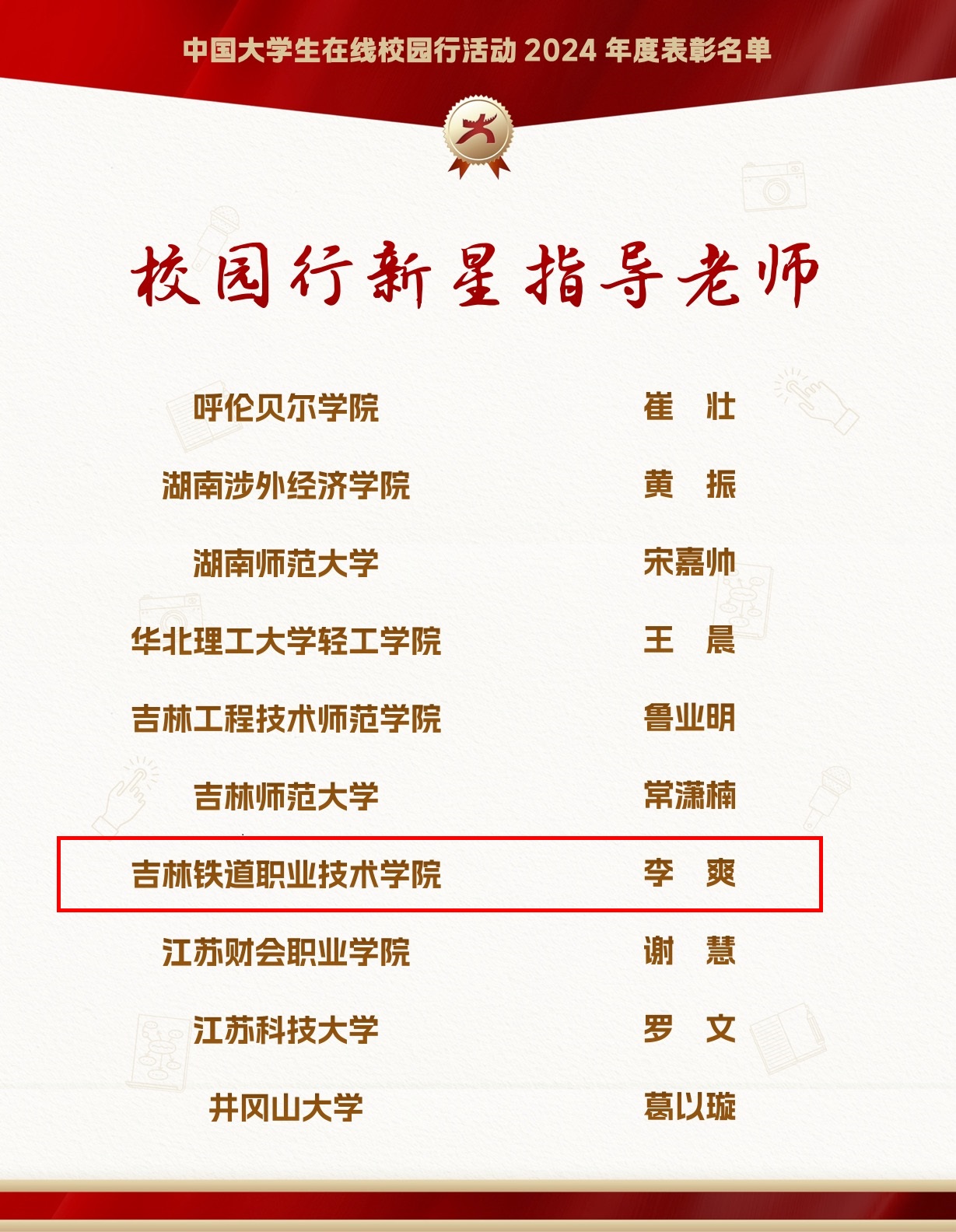 近日,2024年度教育部中国大学生在线校网通及校园行表彰榜单新鲜出炉,我校六个项目在评选中喜获佳绩,学校获评“优秀校网通站”、学生工作处获评“校园行活动优秀组织单位”、学生工作处李爽获评“校网通优秀指导教师”和“校园行新星指导教师”、高铁综合技术学院赵轩同学获评“优秀学生编辑”,“小中校园行|漫步校园·体验吉铁院9·21爱生节”获评“优秀年度内容榜单”。“吉林铁道职业技术学院学工在线”连续六周排名中国大学生在线校园号热度榜高职高专榜单第一,发布的校园行活动内容多次推送到中国大学生在线首页。