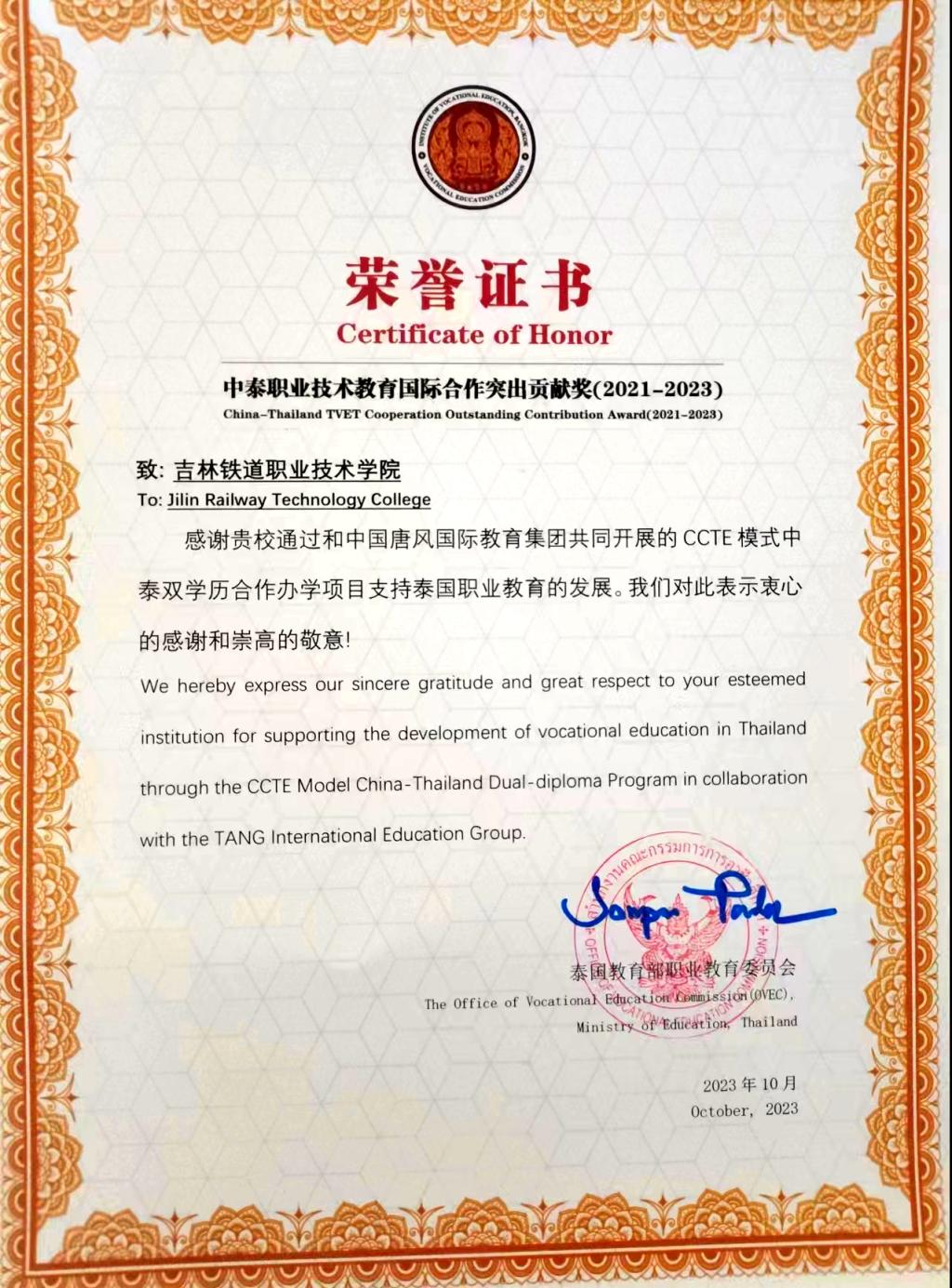 学校积极开展“中文+职业技能”项目。2021年,学校与泰国春武里技术学院创办了吉林省高职院校首个海外学校——中泰詹天佑学院,作为推进落实“一带一路”倡议和泰国“工业4.0”战略的教育领域重要项目,并开展泰国留学生培养、具有国际影响力的职业教育标准、资源建设等工作,提升了我校的职教国际影响力。