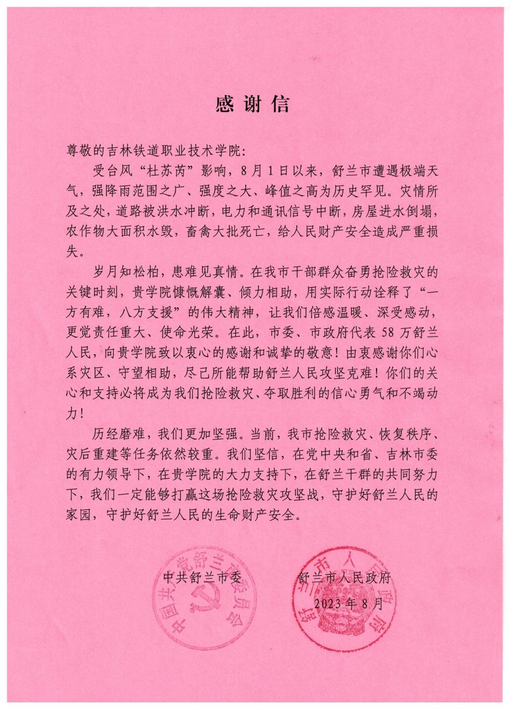 近日,学校收到舒兰市委市政府书面感谢信。信中,舒兰市委市政府表达了对我校全力帮助舒兰市台风灾后重建工作的衷心感谢和诚挚敬意。