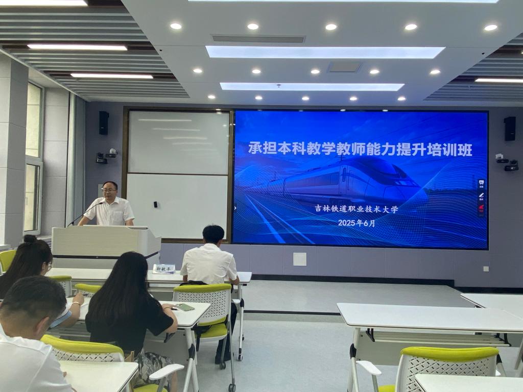 为全面提升本科层次教育教学质量,部署新学期教学工作,6月27日下午,“吉林铁道职业技术大学本科专业教学教师能力提升培训”在教学楼211教室举行。本次培训由教务处、教师发展中心联合举办,旨在强化承担本科教学任务教师的核心能力。学校教学督导、相关分院教学副院长、办公室主任、教研室主任以及全体承担本科教学任务的任课教师参加了培训。会议由教务处处长金鹏涛主持。