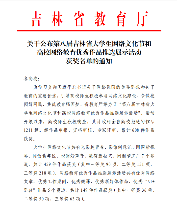 近日,吉林省教育厅公布第八届吉林省大学生网络文化节暨高校网络教育优秀作品推选展示活动获奖名单。我校师生凭借扎实的创作功底与新颖的创新表达,在众多参赛作品中脱颖而出,共斩获6项省级荣誉,其中一等奖1项、二等奖2项、三等奖3项。