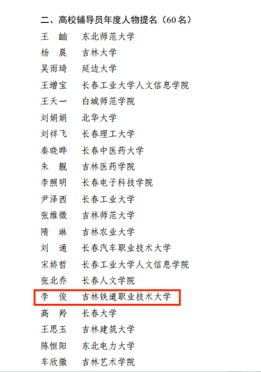 近日,吉林省教育厅公布2025年高校思政课教师年度影响力人物和辅导员年度人物评选结果,我校马克思主义学院思政课教师魏伦荣获“高校思政课教师年度影响力人物提名”,城市轨道交通学院团委书记李俊荣获“高校辅导员年度人物提名”。