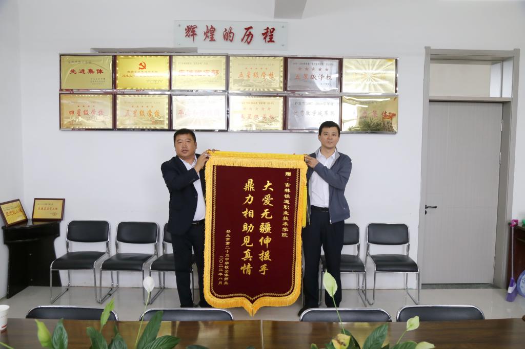 副校长李原福代表学校接受舒兰市第二十五中学赠送的锦旗