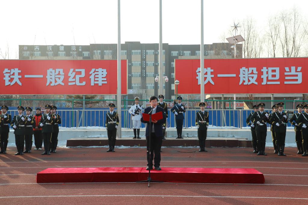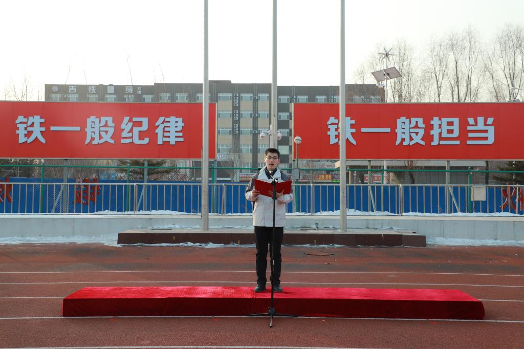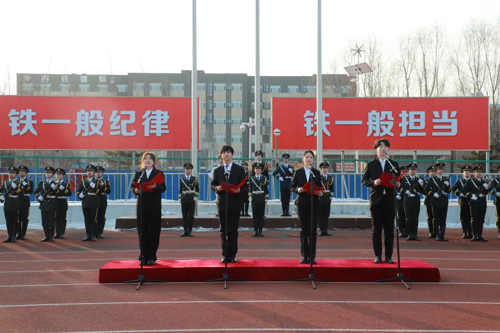 在高高飘扬的五星红旗下,东北亚高铁学院赵天航、铁道运输学院胡艺飘、大数据商务学院范宇轩、铁道工程学院李谯雨四位同学在国旗下献词。他们以青春之名,激励全校青年学生在“十五五”的新征程中,书写属于青年人的时代篇章!