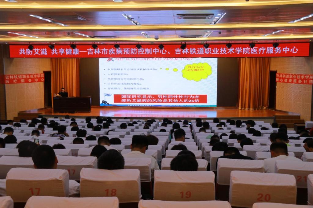 为进一步落实《“健康中国 2030”规划纲要》,深入贯彻《教育部办公厅国家卫生健康委办公厅关于切实加强新时代学校预防艾滋病教育工作的通知》要求,遏制青年学生人群中艾滋病的传播和流行,促进广大青年学生身心健康, 6月14日,我校医疗服务中心邀请到吉林市疾病预防控制中心副主任蔡勇和永吉县疾病预防控制中心工作人员,在图书馆报告厅开展“共防艾滋 共享健康” 防治艾滋病知识宣传讲座。参加讲座的还有校医疗服务中心医护人员、各学院学工教师和学生代表。