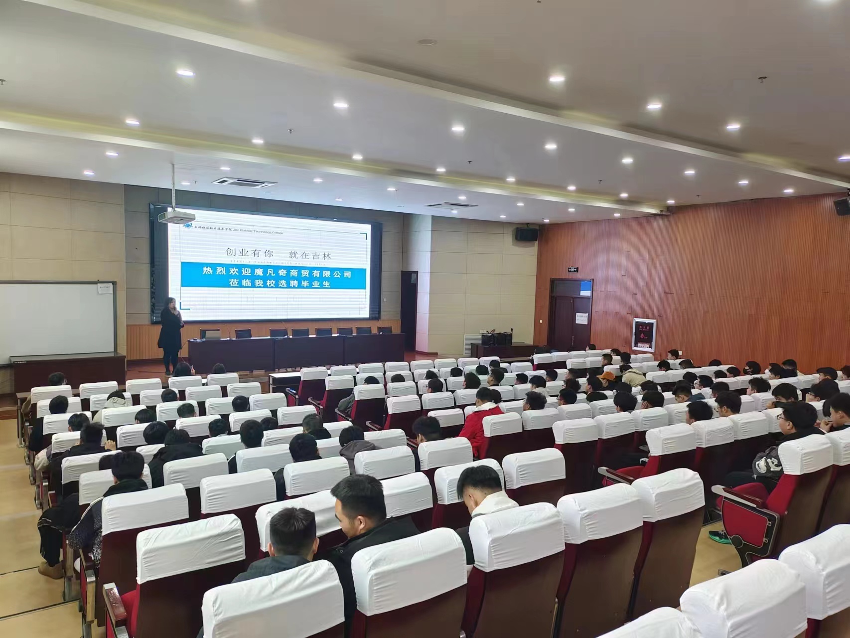 本周共邀请了4家重点招聘单位分别是:长春市悦亿轨道交通科技有限公司、魔凡奇商贸有限公司、山西吉利汽车部件有限公司、福州京东方科技集团股份有限公司等优质企业进校宣讲和面试招聘。公司的招聘负责人详细地阐述了企业优势、业务范围和发展历史等企业概况,介绍了公司的发展方向、招聘岗位、招聘需求和薪资待遇等。同学们积极向企业招聘人员咨询公司培训、升迁管道、学习机会等相关内容。