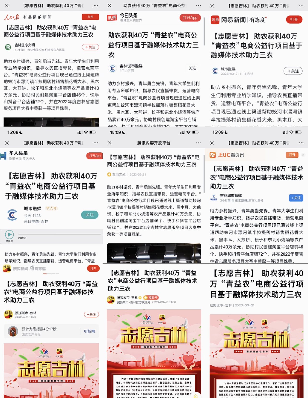 在2022年举办的吉林省新时代文明实践志愿服务项目大赛中,我校荣获一等奖的“电商公益行-基于融媒体技术助力新三农”的志愿公益项目近日被《人民日报》、《今日头条》、《搜狐网》、《网易新闻》等十家媒体相继报道。
