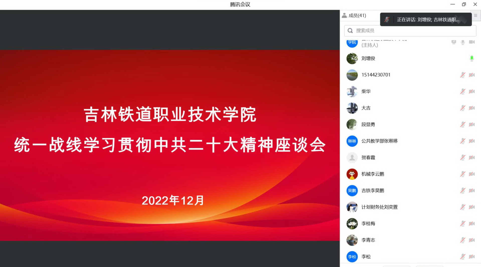 宋春辉强调,全校统一战线要把学习贯彻中共二十大精神作为当前和今后一个时期的首要政治任务。要加强政治思想建设。增进与党同心奋斗的政治共识;要始终坚持团结民主。加强思想政治引领,用务实举措稳定人心、鼓舞人心、凝聚人心;要不断推动学校高质量发展。紧紧围绕学校立德树人根本任务,筑牢培根铸魂育人功能,协助学校党委做好凝聚共识,继续担当起中国共产党的好参谋、好帮手、好同事的政治责任。新的征程上统战工作责任更加重大,全校统战对象要紧密地团结在以习近平同志为核心的党中央周围,同心同德、同心同向、同力同行,共同答好全面建设社会主义现代化国家的时代考题、答好立德树人的时代考题,为把我校早日建成中国特色、世界水平的职业技能型大学而团结奋斗。