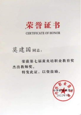 近日,中华职业教育社公布了第七届黄炎培职业教育奖获奖名单。我校高铁综合技术学院莫建国同志荣获杰出教师奖项。