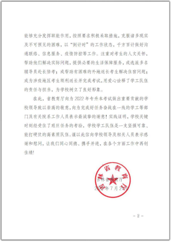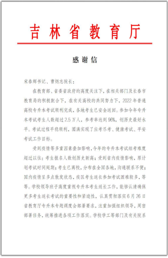 受到疫情等多重因素叠加影响,2022年全省普通高校专升本考试组考难度超过以往。我校高度重视今年的专升本考试工作,注重加强组织领导,召开专题会议部署落实工作任务和要求。在近一个月的组织工作中,我校学工干部主动担当作为,面对困难迎难而上,面对矛盾主动化解。在全体学工干部的共同努力下,我校圆满完成了今年专升本考试的组织工作。实践证明,我校学工队伍是一支坚强可靠、能打硬仗的高素质队伍,是一支具备攻坚克难和解决实际问题能力的高水平队伍。为此,吉林省教育厅向我校宋春辉书记、曹炳志校长发来感谢信,表达对学校统筹推进工作以及奋战一线的学工干部的诚挚谢意。