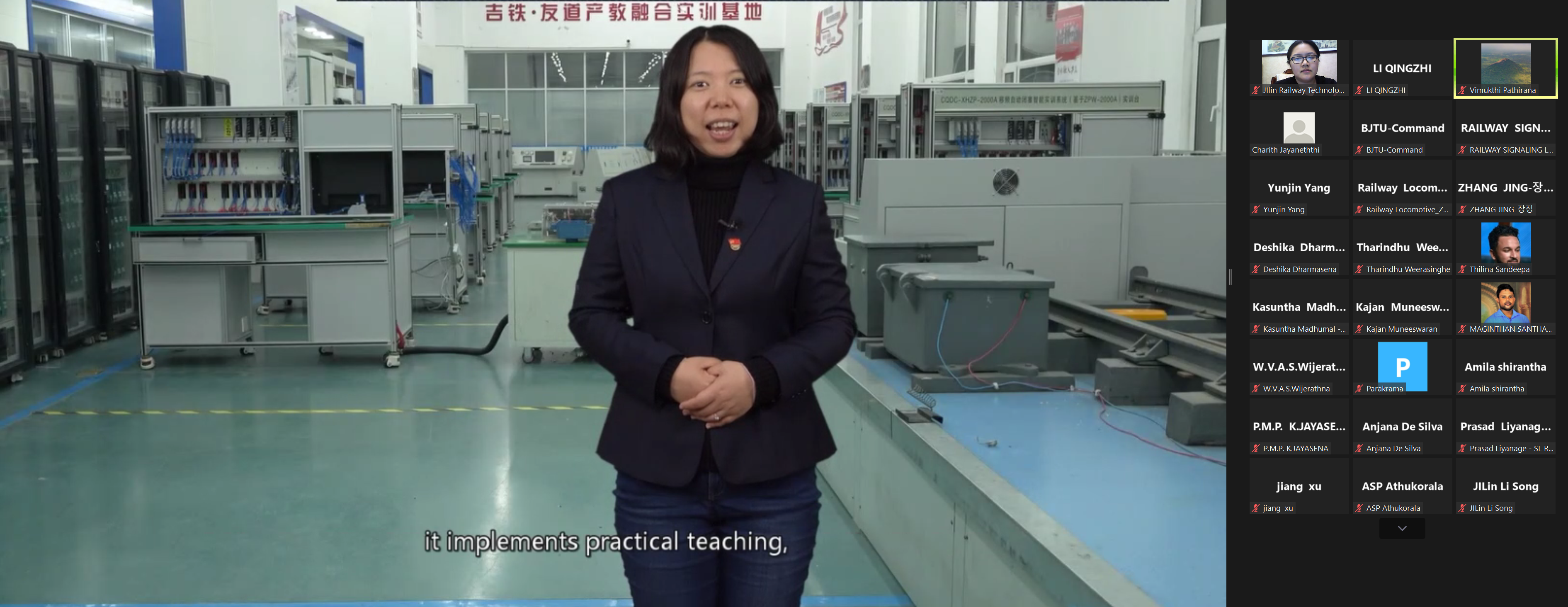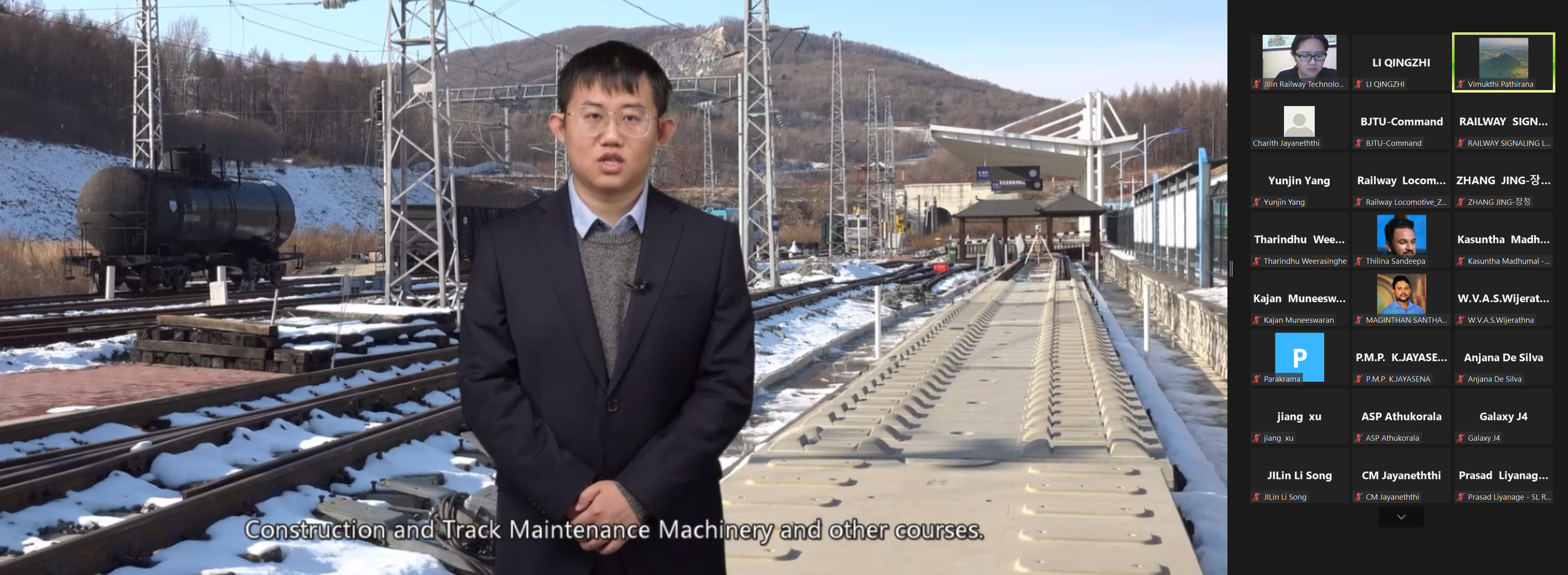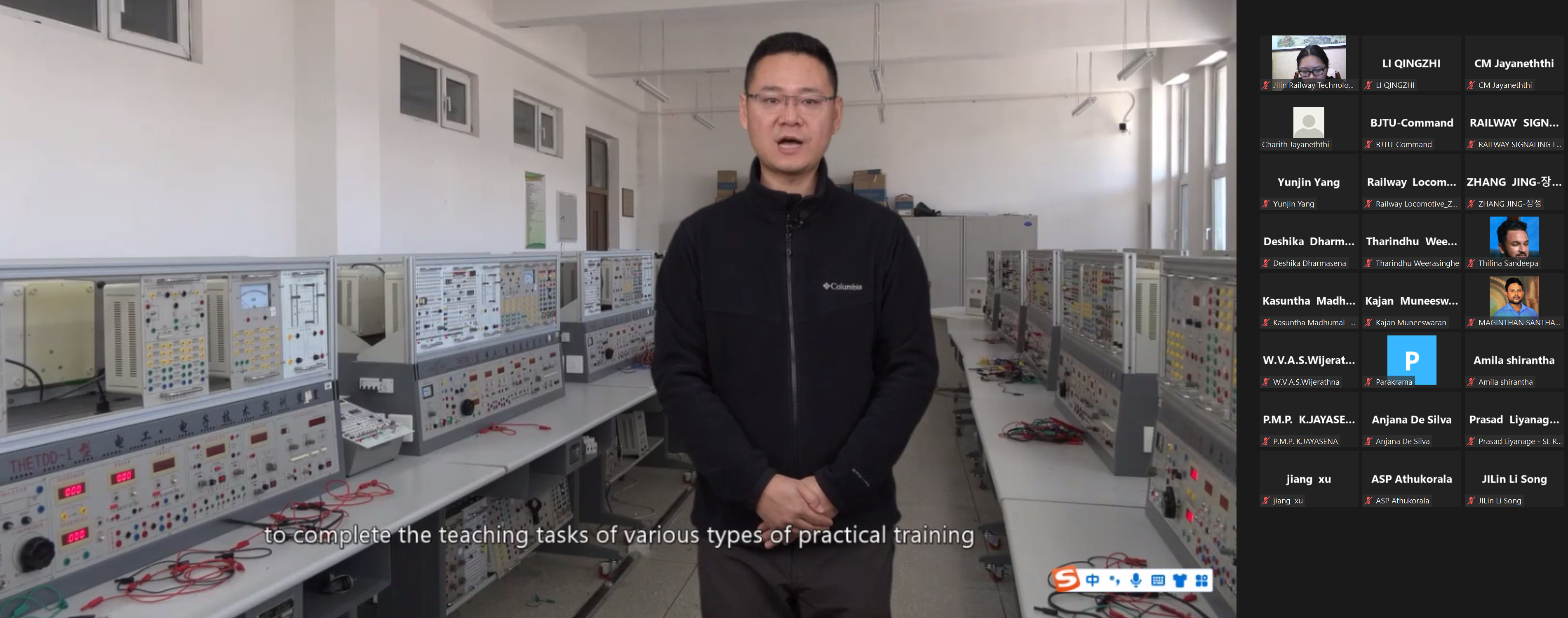 我校铁道运输学院姜旭、电气工程学院李松、高铁综合技术学院刘烨、东北亚高铁学院张晶、铁道工程学院杨昀锦、铁道机车学院赵猛等六名专业教师就机、车、供、电、辆实训设备及实训基地等内容进行了线上英文专业讲解及答疑。通过直播教学、交流研讨及“云参观”,让研修班学员从多方面、多角度了解中国高铁技术和装备,感受中国铁路的高速发展。