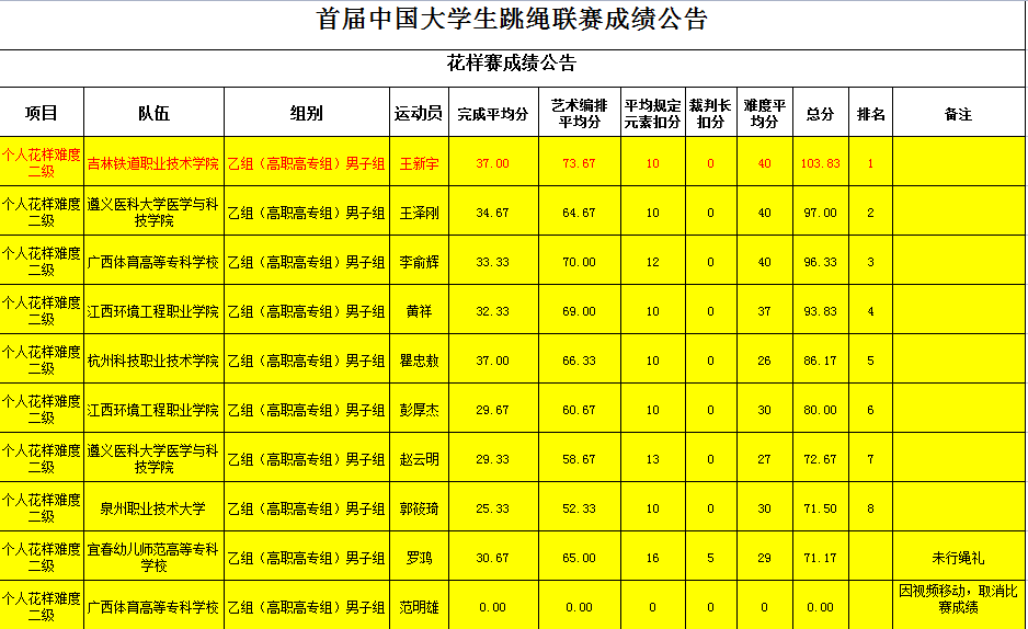 由体育部王志东主任担任领队,苏航老师任教练员,带领两名运动员参加了乙组(高职高专组)的30秒单摇跳、3分钟单摇跳、个人花样二级难度三个项目的比赛,经过不懈的努力,最终我校花样跳绳队队员王新宇同学在个人花样二级难度比赛中获得冠军。
