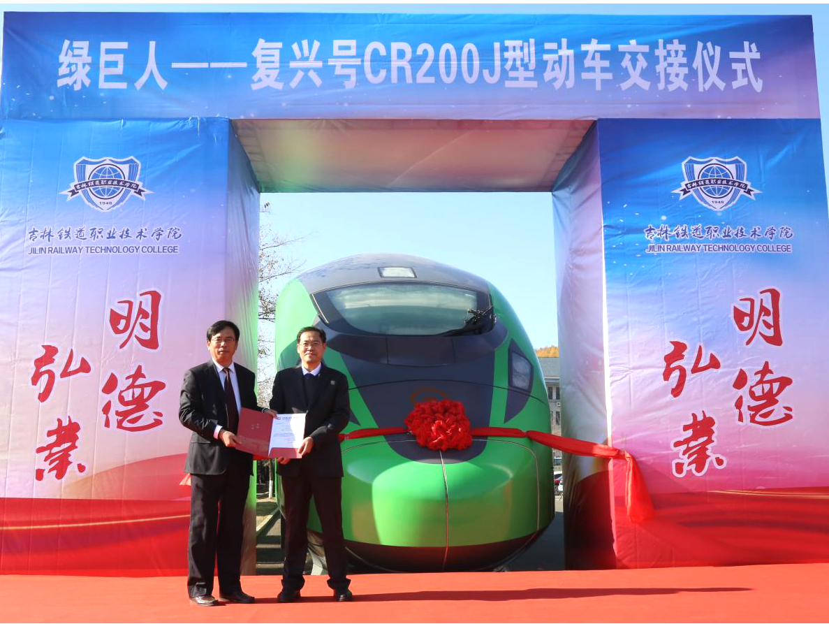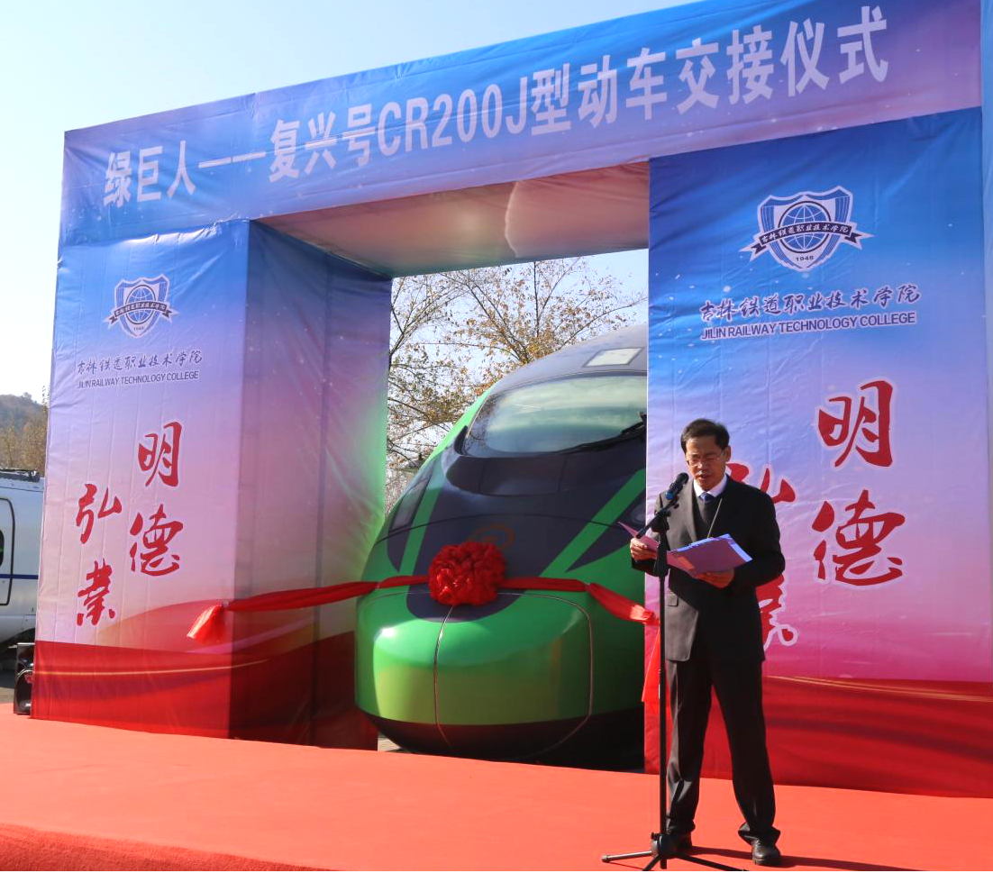 吉林省教育厅一级巡视员战高峰厅长、原长春中医药大学校长宋柏林、吉林工商学院党委书记张炳辉、吉林职业技术教育学会会长、吉林省职业教育研究中心主任于志晶、吉林省财政厅国有资产处原处长侯克兴、省教育厅规划处副处长杨收梅、永吉县人民政府副县长郭林华、中车唐山机车车辆有限公司党委副书记、副总经理郭良金以及我校党委书记宋春辉共同为绿巨人”复兴号CR200J 型动车入校交接剪彩。