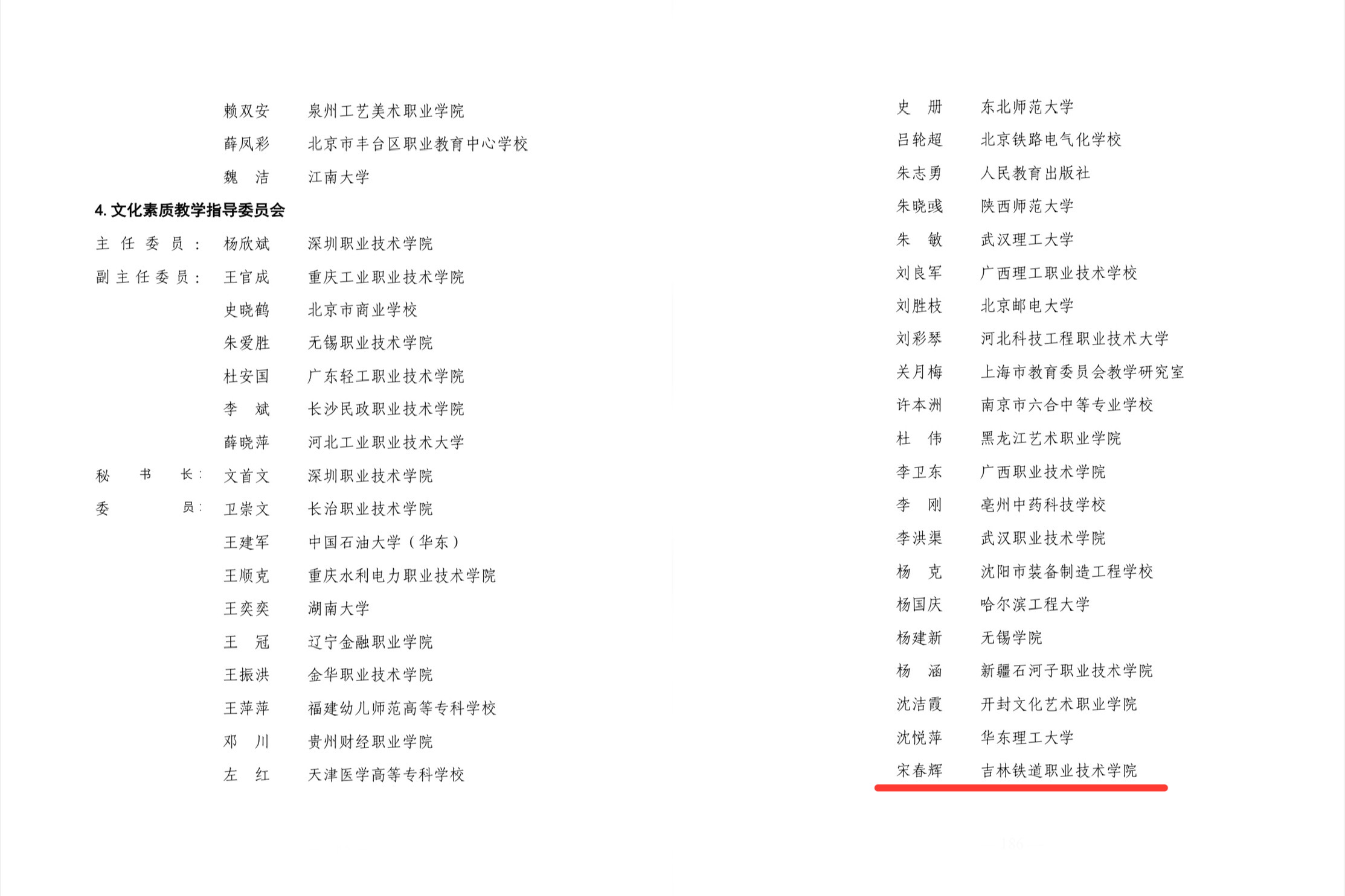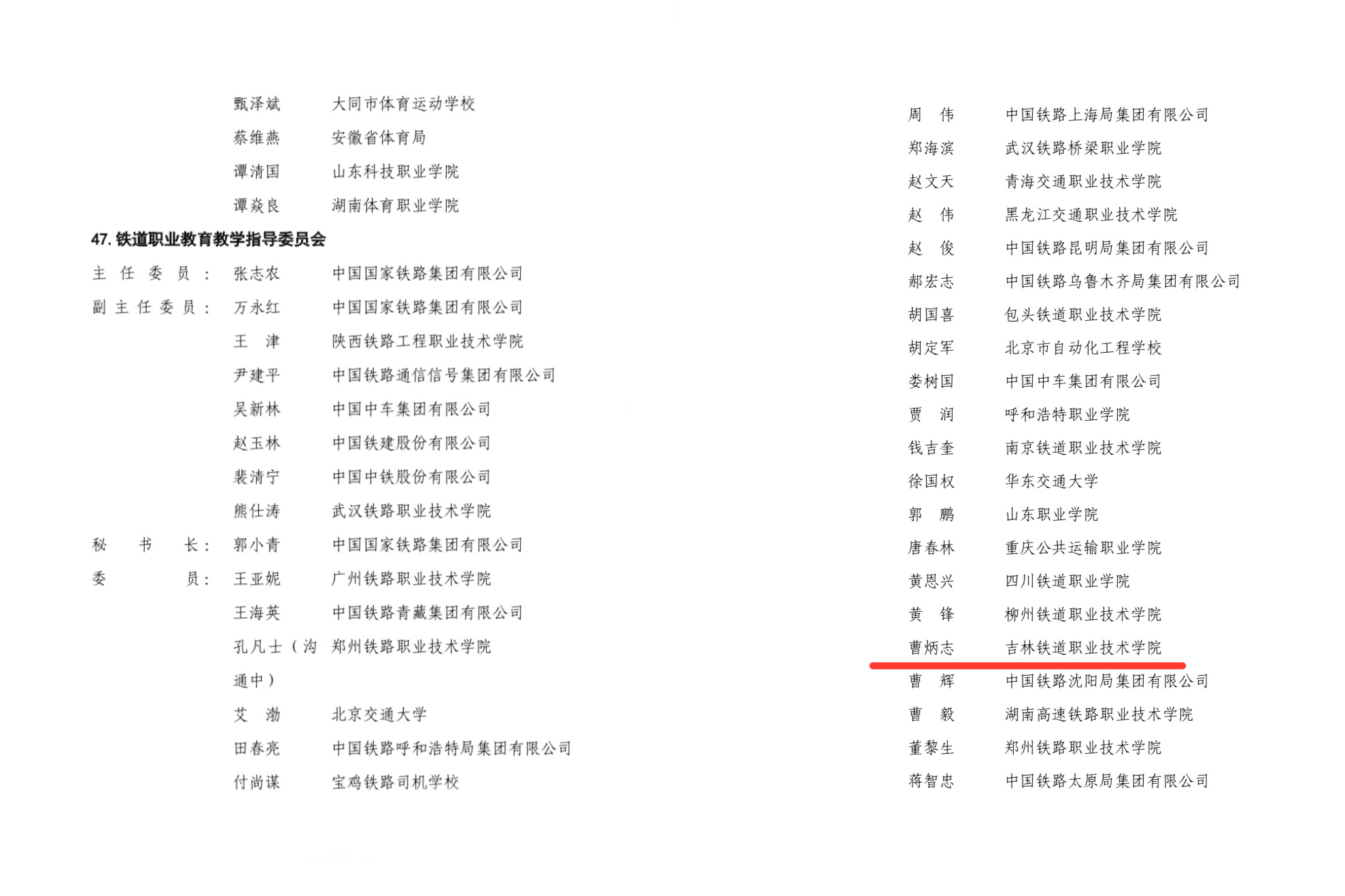 学校党委书记宋春辉、校长曹炳志分别当选教育部职业院校教学(教育)指导委员会文化素质教学指导委员会委员、教育部全国行业职业教育教学指导委员会铁道职业教育教学指导委员会委员。