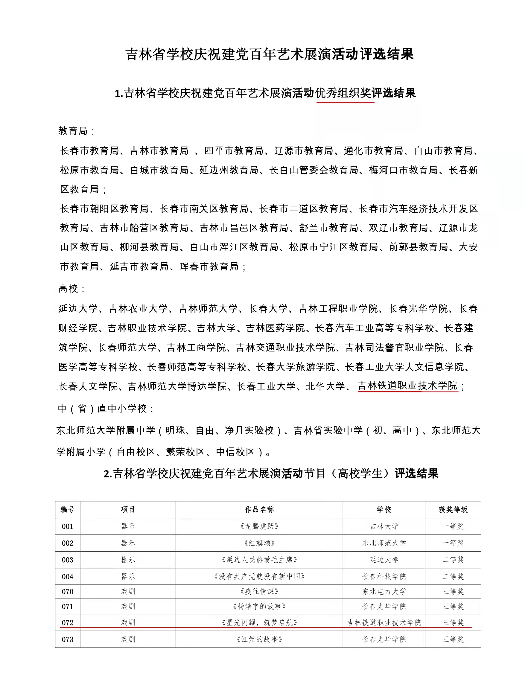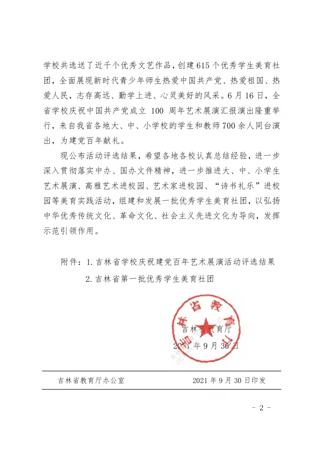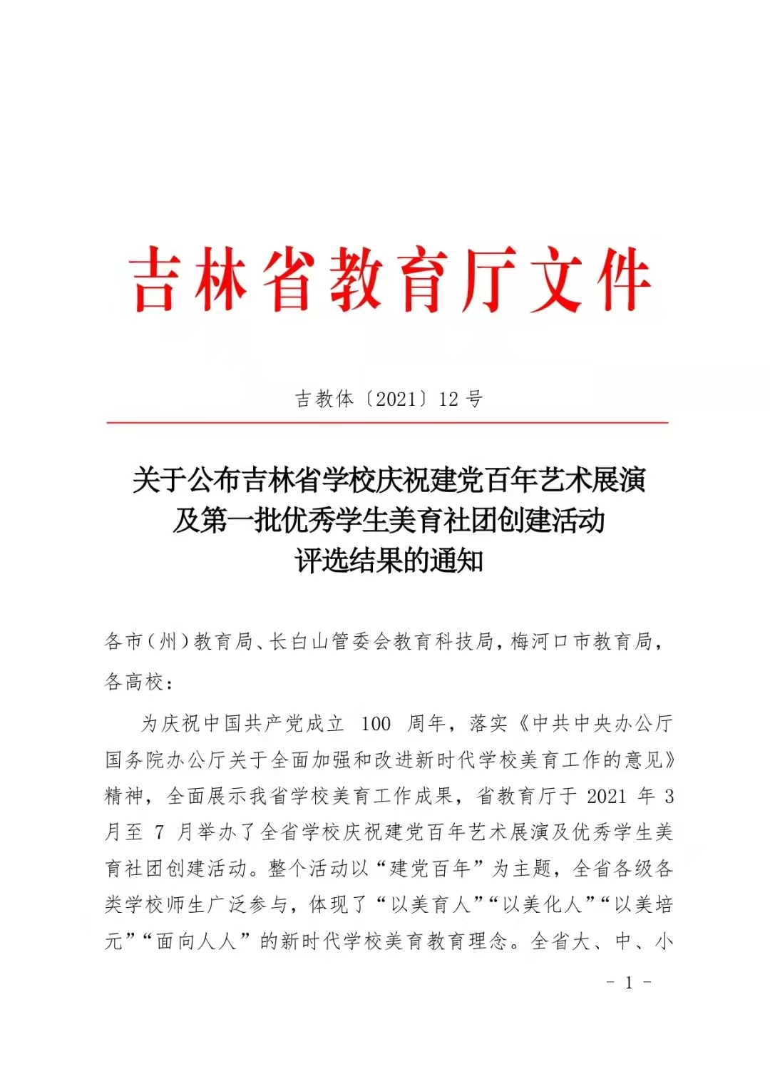 为了庆祝中国共产党成立100周年,吉林省教育厅于2021年3月至7月举办了以“建党百年”为主题,庆祝建党百年艺术展演及优秀学生美育社团创建活动。全省各级各类学校师生广泛参与,共选送近千个优秀文艺作品。
