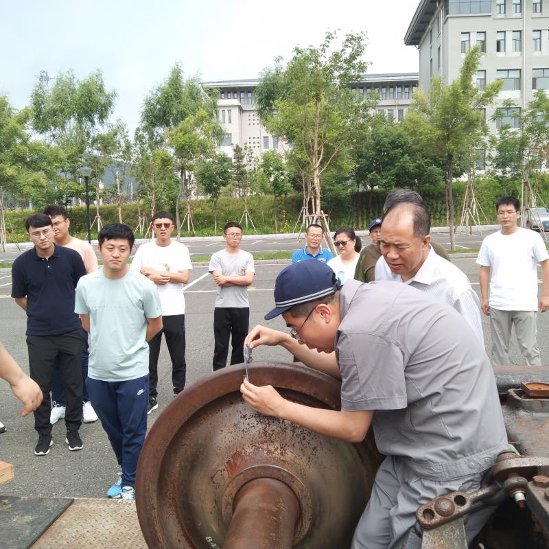 曹炳志在铁道货车实训基地同学院老师们一同观看了下学期承担新课程的青年教师张超关于《车辆故障检修》课程的技能演示,他熟练的使用轮径尺讲授课程中“轮对尺寸检测”技能项目,青年教师孙奇关于《检车员》课程的技能演示,针对课程中的“单车技术检查”项目进行了作业讲授。曹炳志对两位青年教师能主动向技能名师和老教师学习、勇于承担教学任务、提升教学能力给与肯定,并号召教师们在教学中主动钻研,结合现场作业流程,思考如何对测量工具和作业流程进行优化改进。