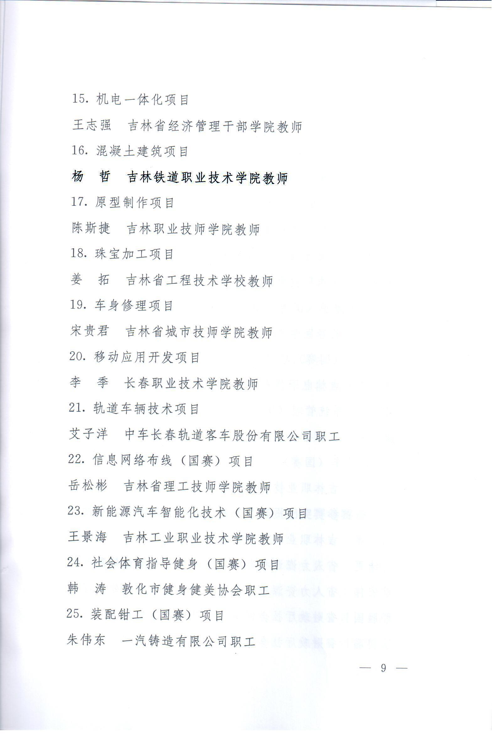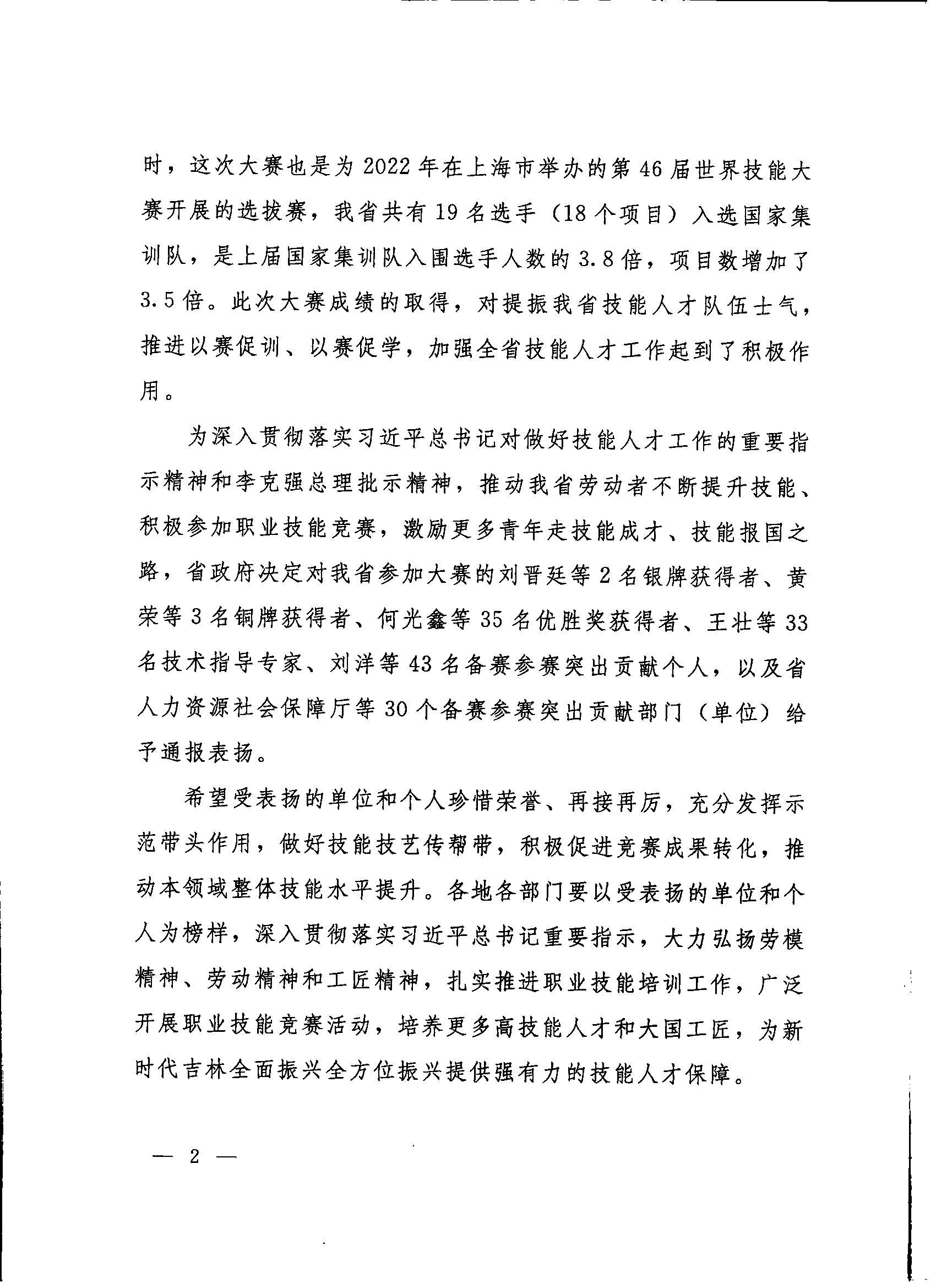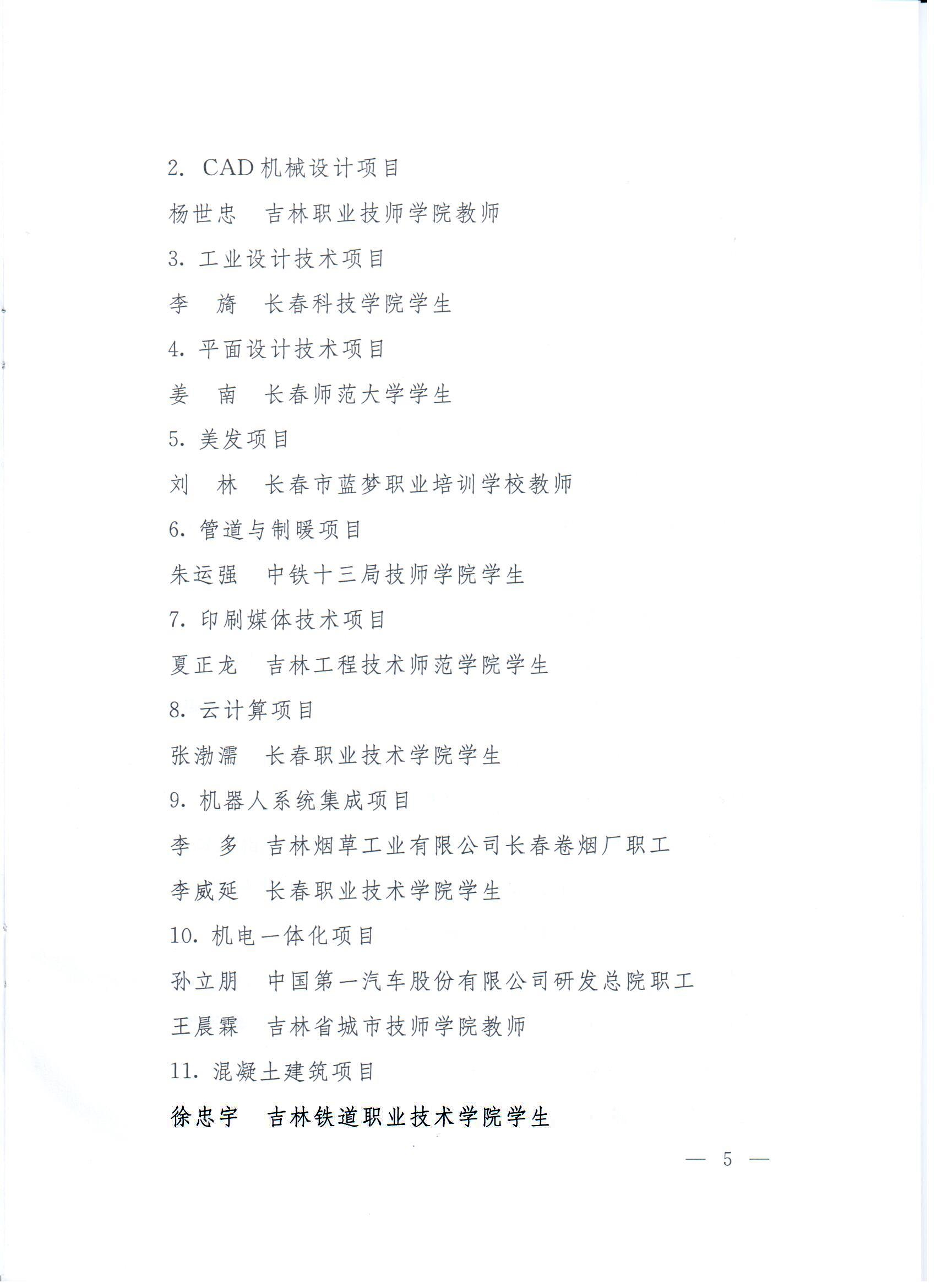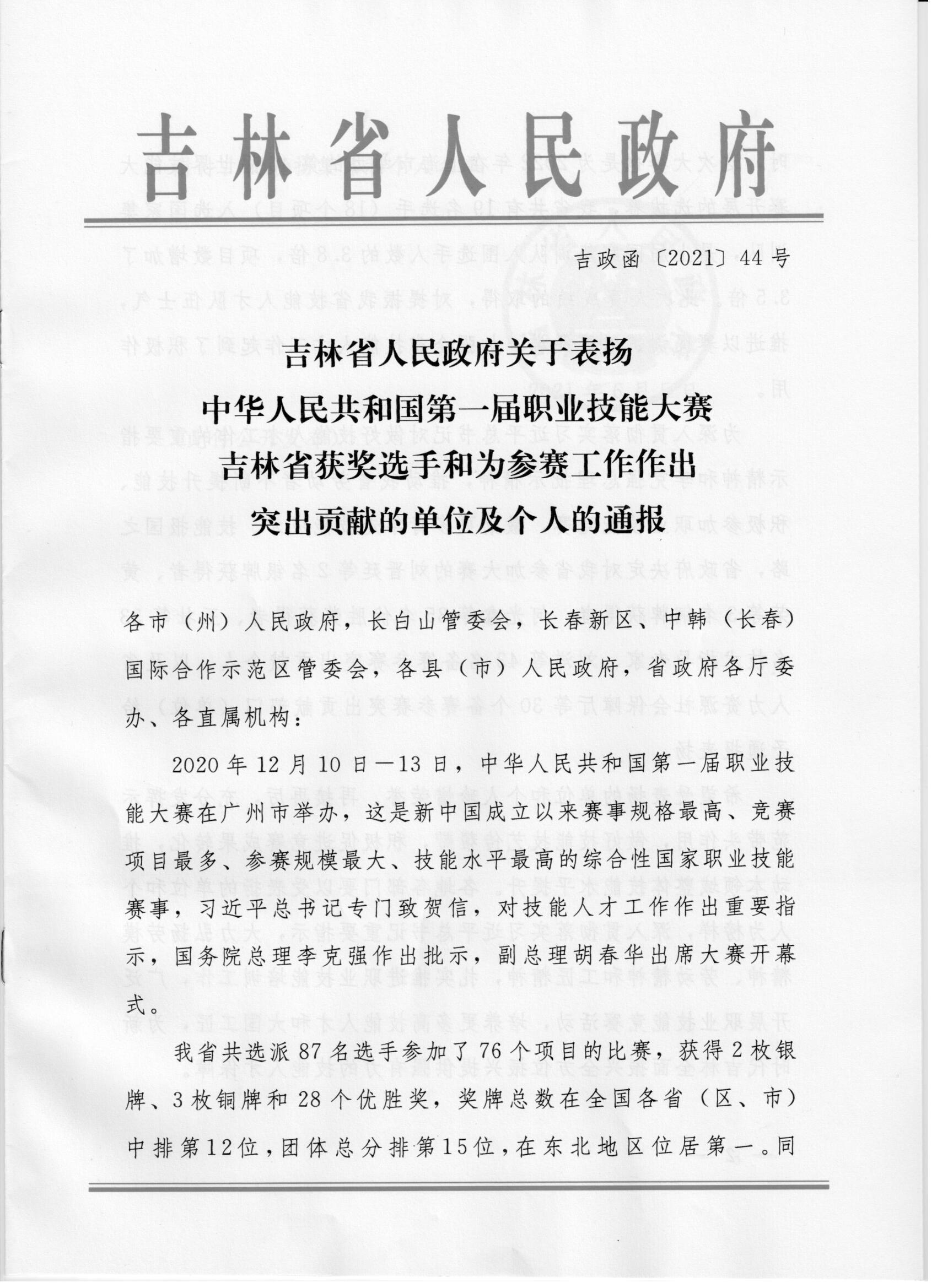 2021年6月5日,我校在中华人民共和国第一届职业技能大赛中的突出表现受到吉林省人民政府表扬,其中我校被评为“备赛参赛突出贡献部门(单位)”,我校铁道工程学院教师杨哲作为技术指导专家受到表扬,我校铁道工程学院学生丁文祥、徐忠宇参加“混凝土建筑”赛项获得“优胜奖”受到表扬。