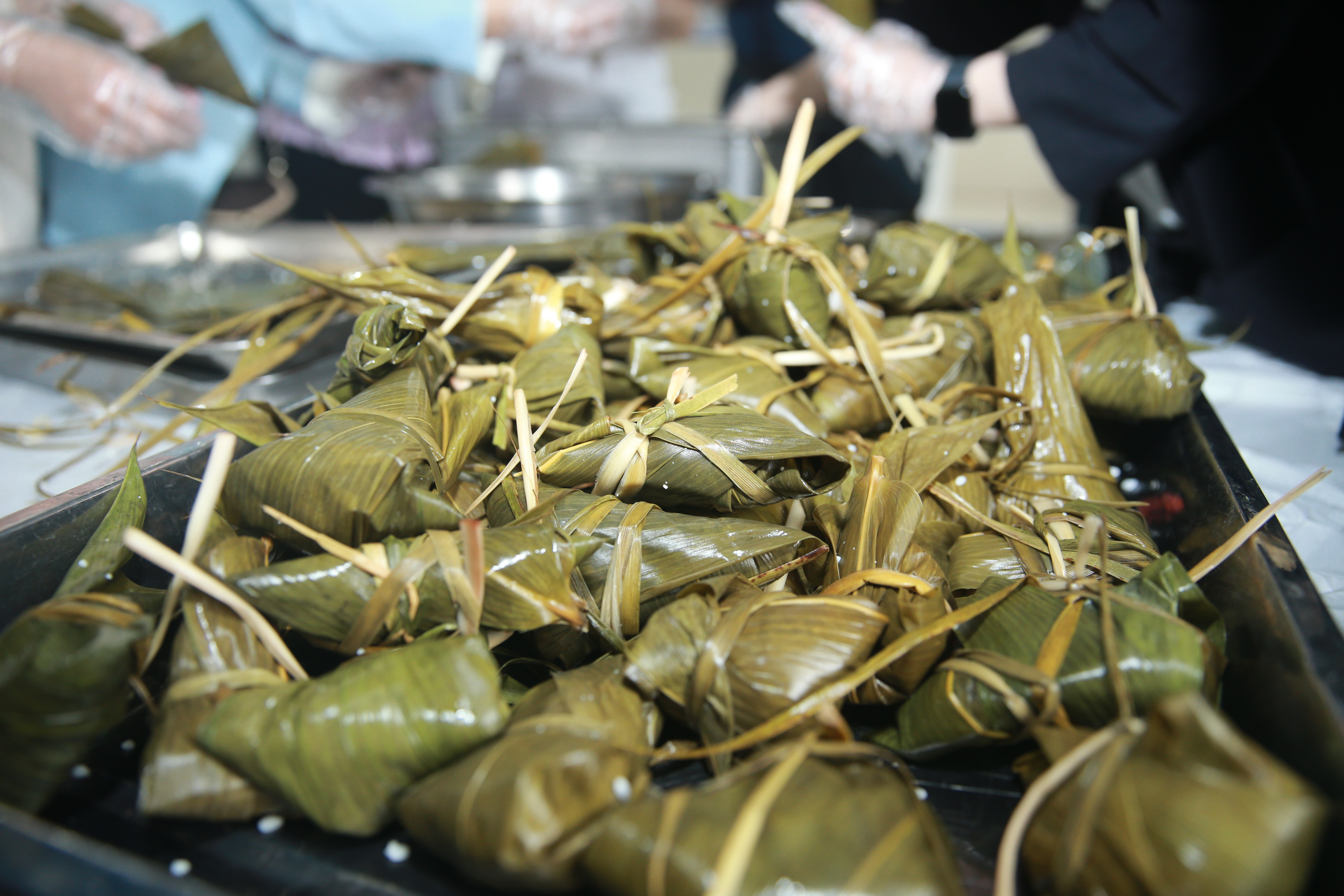 后勤管理处和餐饮中心的工作人员提前做了充分的准备工作,泡好的糯米和红豆、清洗干净的大枣、葡萄干、粽叶和马莲绳等必备材料整齐地摆上桌,15个分工会的教职工们便一起开始包粽子、迎端午,副校长李欣参加了此次活动。