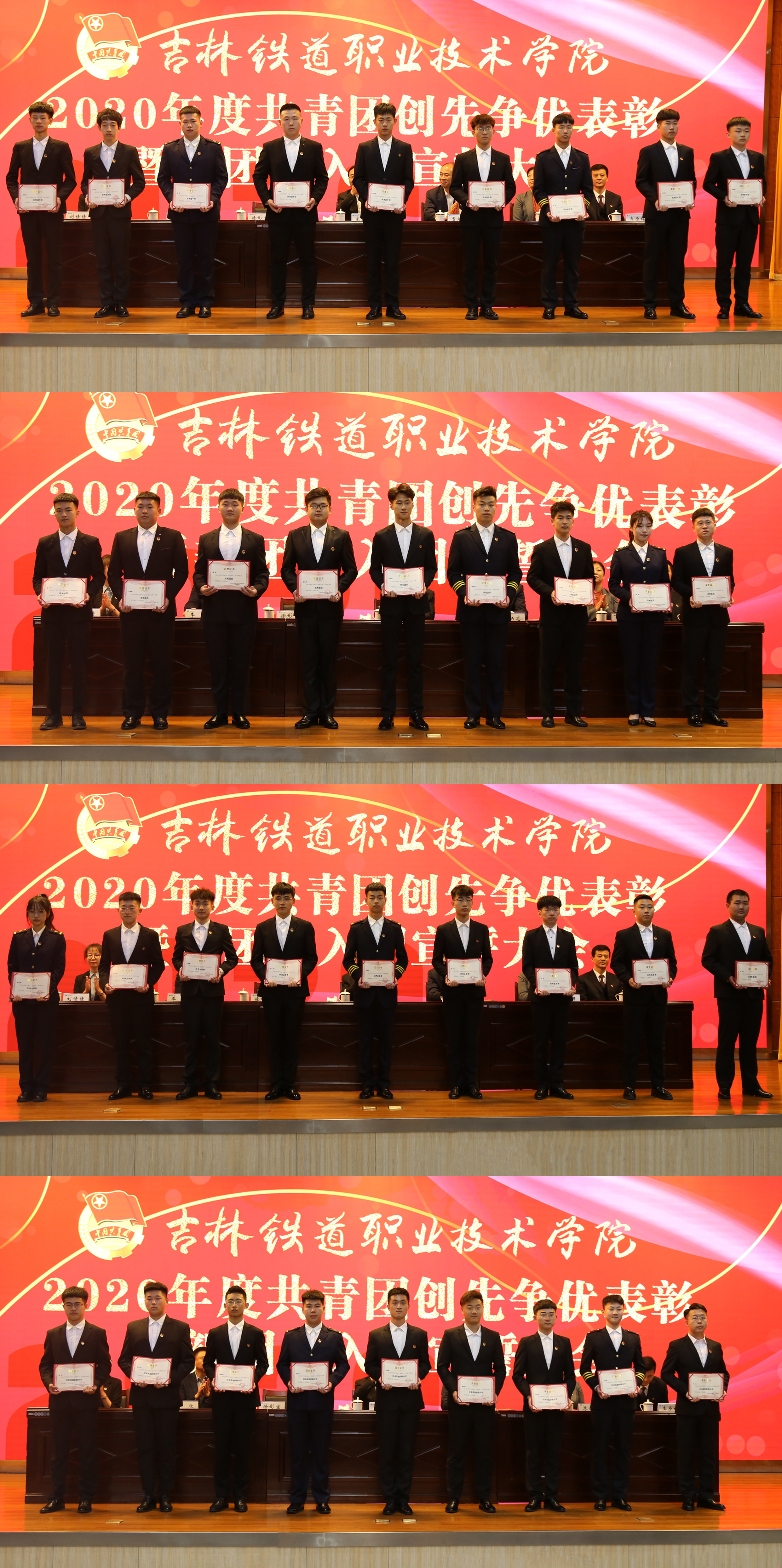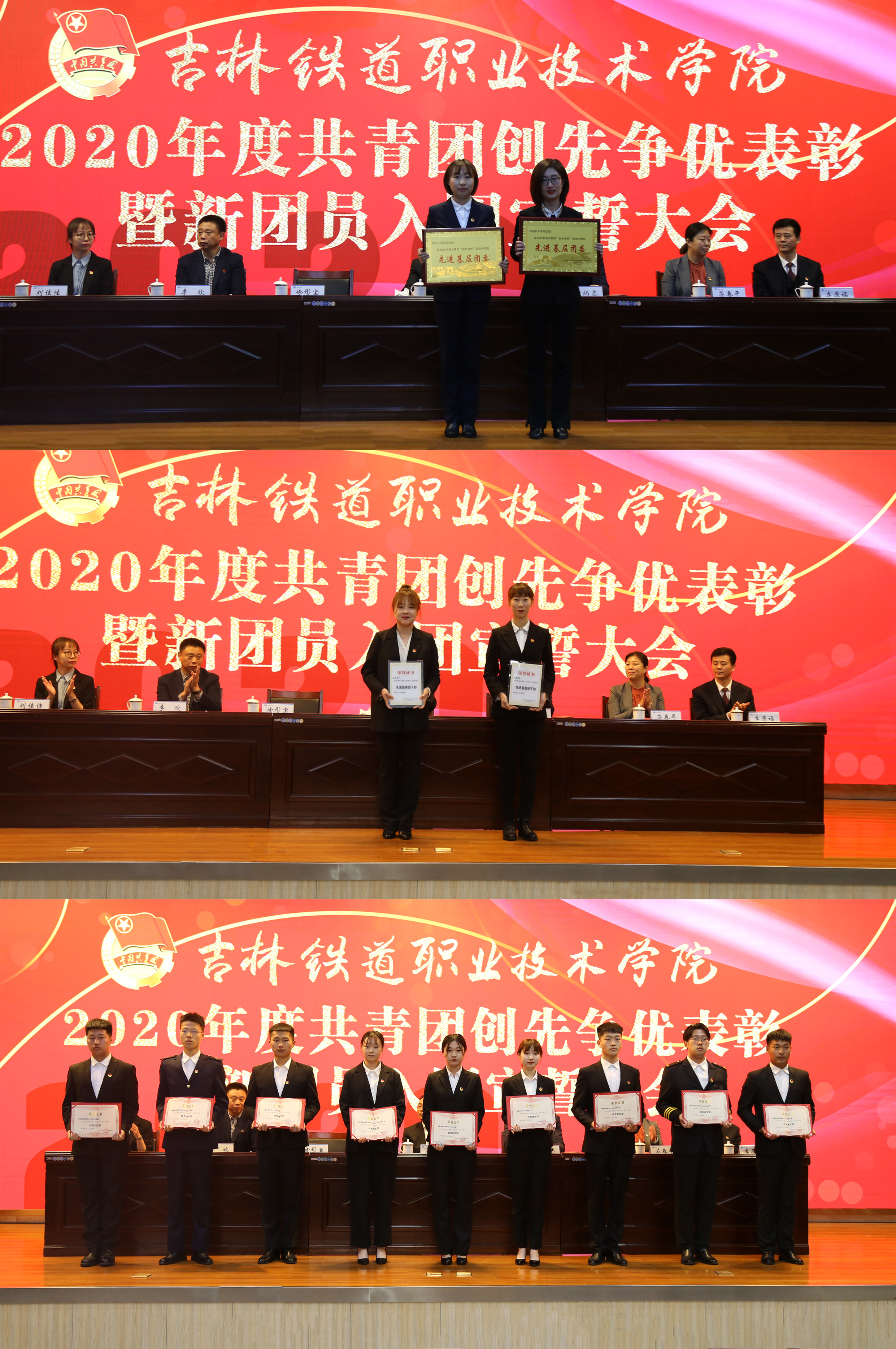 会议在庄严的国歌声中拉开帷幕。团委书记刘佳佳同志代表学校团委作了《守初心迎建党百年担使命谱青春华章—2020年度共青团工作报告》;学工部部长李原福同志宣读《2020年度共青团工作表彰决定》;与会领导为获奖的先进集体和优秀个人颁奖;铁道机车学院党总支副书记曹煜、城市轨道交通学院学生吕霖、东北亚高铁学院学生纪博文分别代表获奖的先进集体、优秀个人和新团员发言。