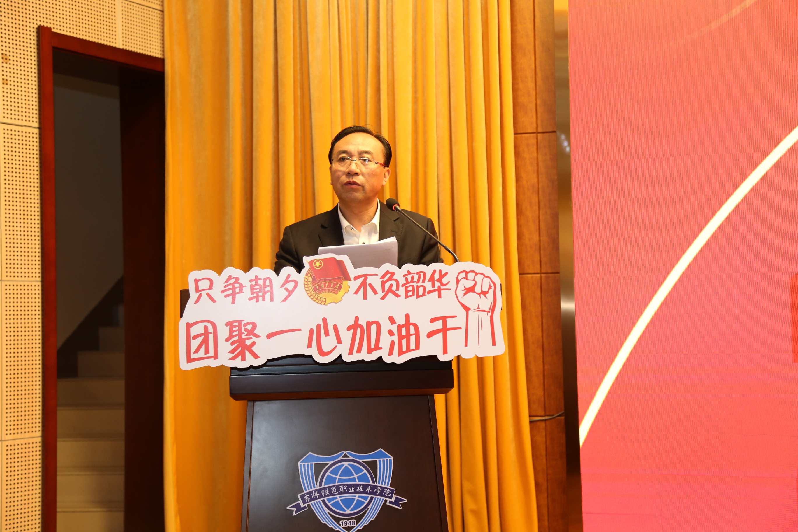 宋书记代表学校党委发表题为《肩负历史使命担当复兴大任—为建设中国特色、世界水平的职业技能型大学贡献青春力量》的讲话。宋书记在讲话中首先向受到表彰的先进集体和优秀个人表示了祝贺,向全校的青年朋友们致以诚挚的问候,对2020年度学校共青团工作给予了充分肯定。他深入解读了五四精神的时代内涵,并鼓励广大青年,要始终牢记习近平总书记的谆谆教导,坚定理想信念、练就过硬本领、矢志艰苦奋斗、锤炼高尚品格,勇敢肩负起时代和人民赋予的重任,让伟大的五四精神在中华民族伟大复兴的壮阔进程中放射出更加夺目的时代光芒。他向全校团员青年提出了几点希望:一要立大志,做中国特色社会主义共同理想的坚定信仰者,顺应时代大势、勇立时代潮流,书写无悔于时代的青春篇章;二要明大德,做当代中国爱国主义的忠实实践者,追求和推崇高尚的道德境界,坚守正确的价值观,在积极的道德实践中明德修身;三要成大才,做党和国家事业的合格建设者,珍惜大好时光、加强社会实践、立下愚公之志,在担当中历练,在尽责中成长;四要担大任,做走在时代前列的勇敢开拓者,把自己的前途与吉林振兴发展联系在一起,积极响应省委书记景俊海在吉林大学出席“创业有你 就在吉林”助力新时代吉林振兴发展首场宣讲报告会上对全省高校毕业生发出的邀请,不负青春韶华、情系白山松水,逐梦成长成才,在新时代吉林振兴发展实践中谱写青春华章。