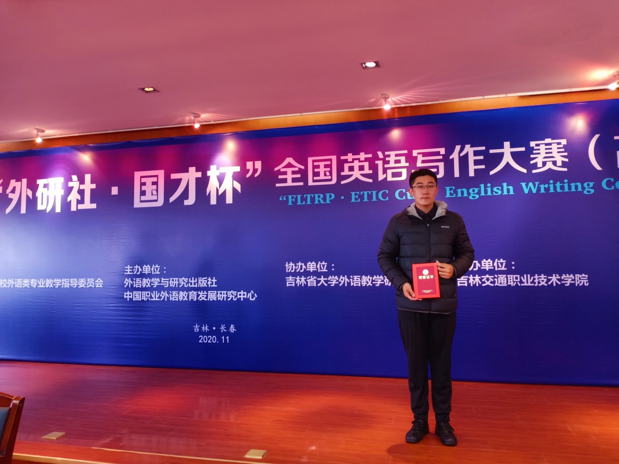 2020年11月1日,在教育部职业院校外语类专业教学指导委员会指导下,由中国职业外语教育发展研究中心和外语教学与研究出版社联合主办的2020“外研社·国才杯”全国英语写作大赛-吉林省复赛中,我校铁道交通运营管理1801班师嘉俊、城市轨道交通运营管理1901班朱思垚同学分别获公共英语组一等奖、三等奖,铁道车辆1902班张席铭同学获英语专业组二等奖。
