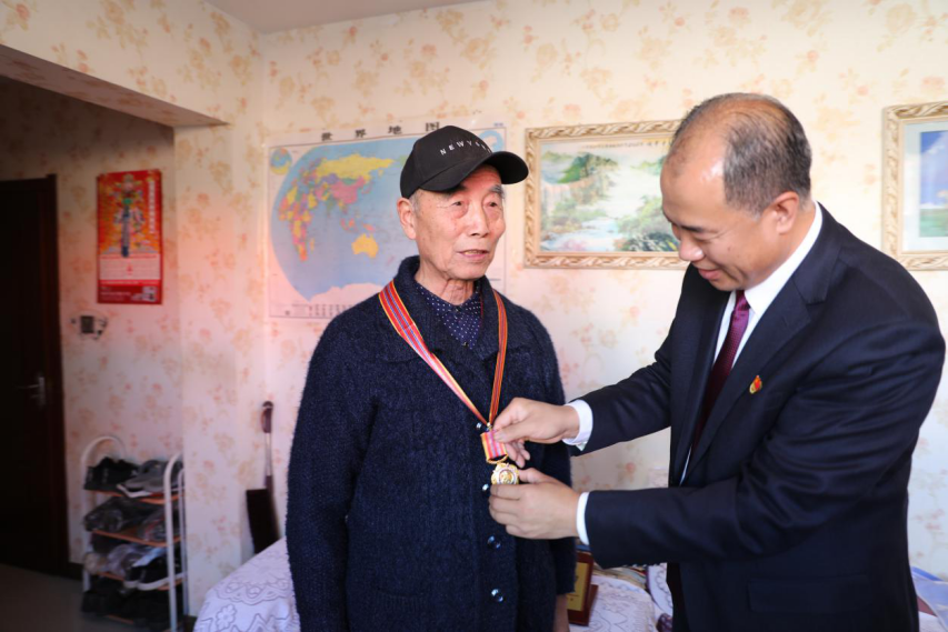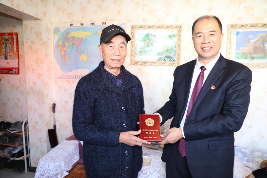 岳金城老人1950年12月参加抗美援朝,1953年抗美援朝战争胜利后回国。在纪念中国人民志愿军抗美援朝出国作战70周年之际,中共中央、国务院、中央军委向参加抗美援朝出国作战的、健在的志愿军老战士老同志颁发“中国人民志愿军抗美援朝出国作战70周年”纪念章。在走访慰问过程中,曹炳志校长为岳金城老人佩戴抗美援朝纪念章,送上了鲜花和果篮。岳金城老人感谢党和人民给予的荣誉。他向大家讲述了当年抗美援朝时艰辛而又难忘的经历,以及当时战斗生活的情景。曹炳志校长对志愿军老战士不怕牺牲、保家卫国、为国家和人民所作出的伟大贡献表示敬意。参加走访的同志听后也都深受感动和教育,深深感到在和平年代更要铭记这来之不易的伟大胜利。曹校长还关切询问了老人的身体健康情况和生活起居,表达了学校对他的关心和问候。