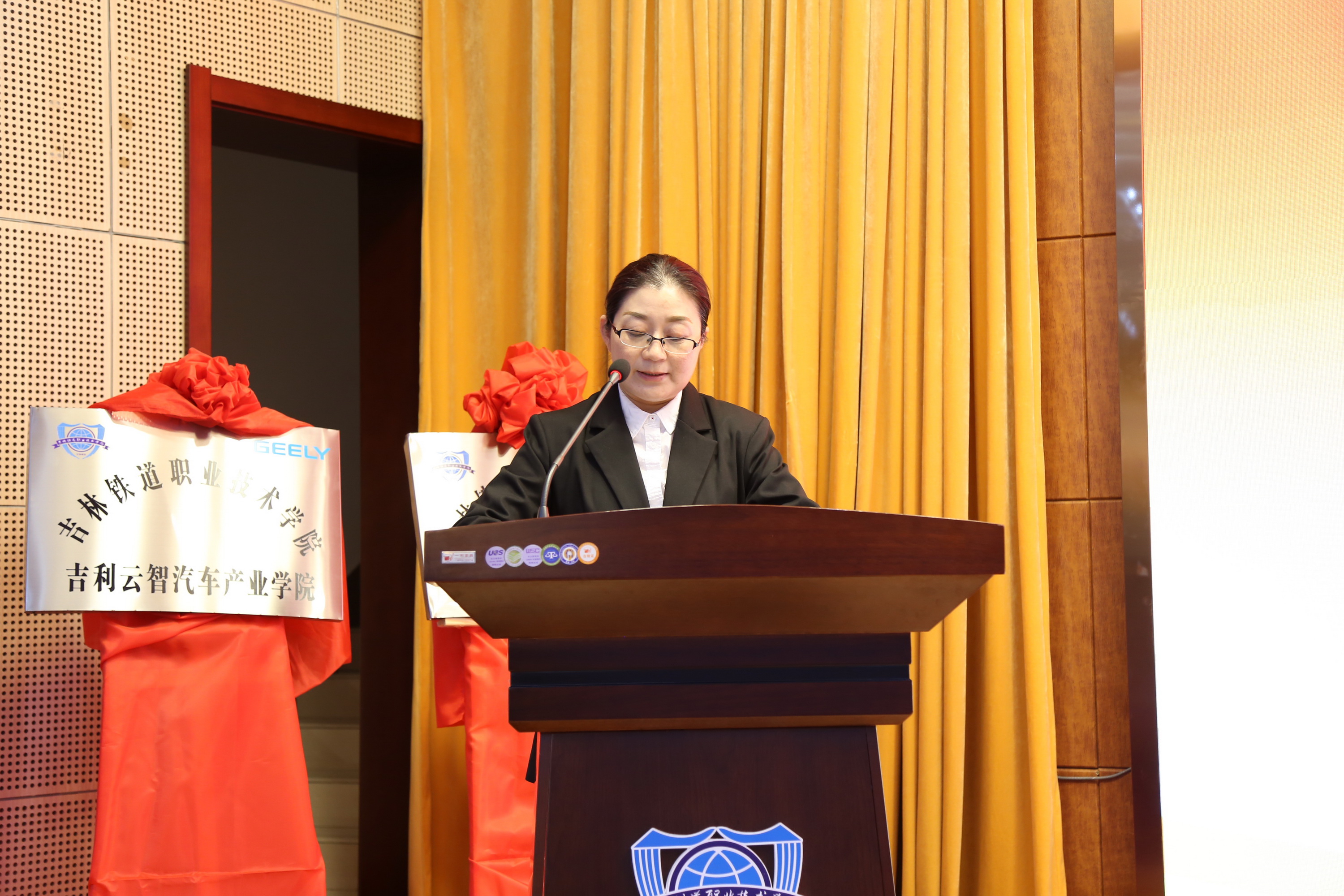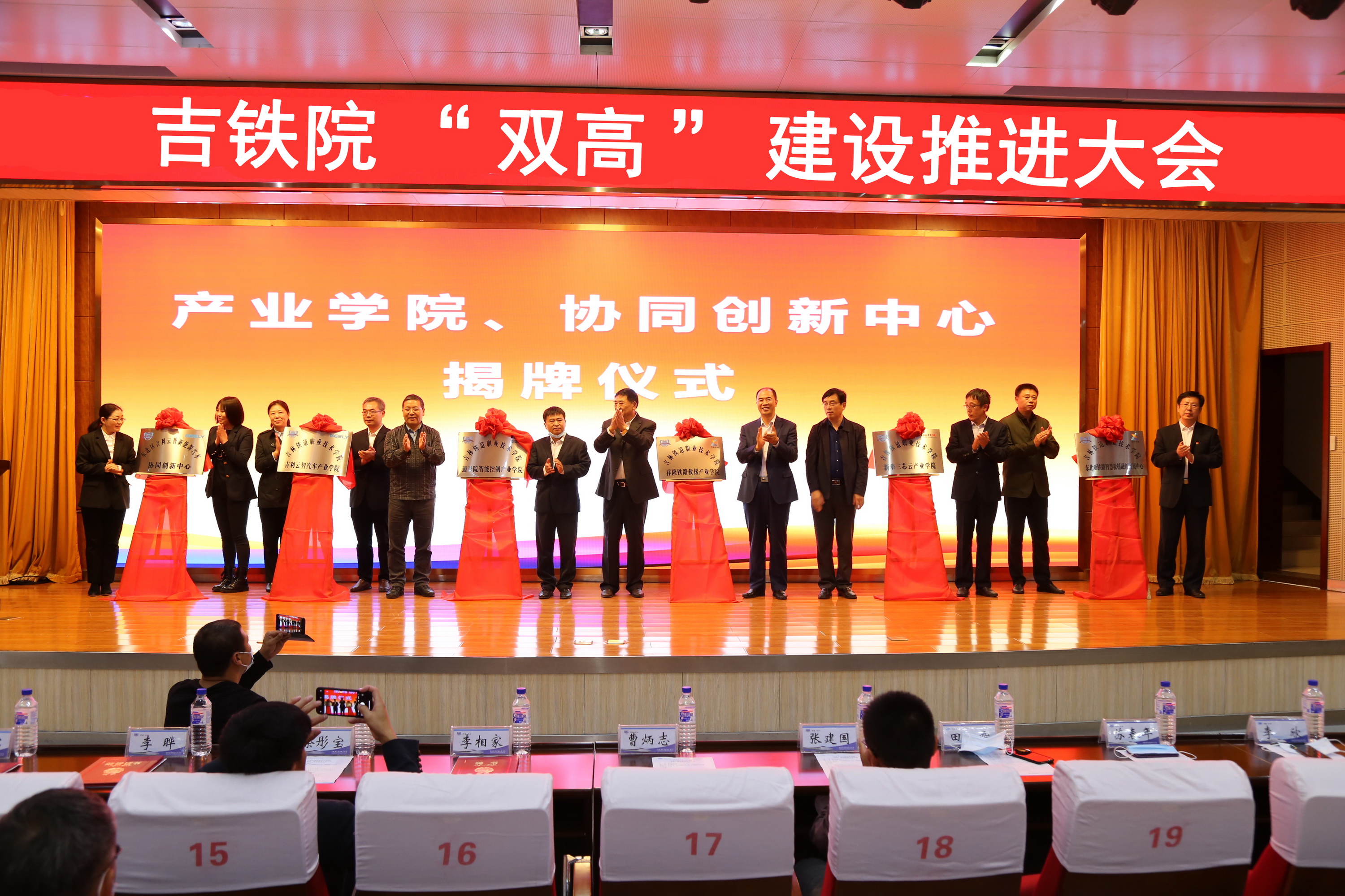然后,与会领导为吉铁院—祥隆铁路救援产业学院、吉铁院—吉利云智汽车产业学院、吉铁院—新华三芯云产业学院、吉铁院—通号智能控制产业学院等四个产业学院及祥隆铁路救援技术协同创新中心和吉利云智汽车技术协同创新中心等两个协同创新中心进行了揭牌。