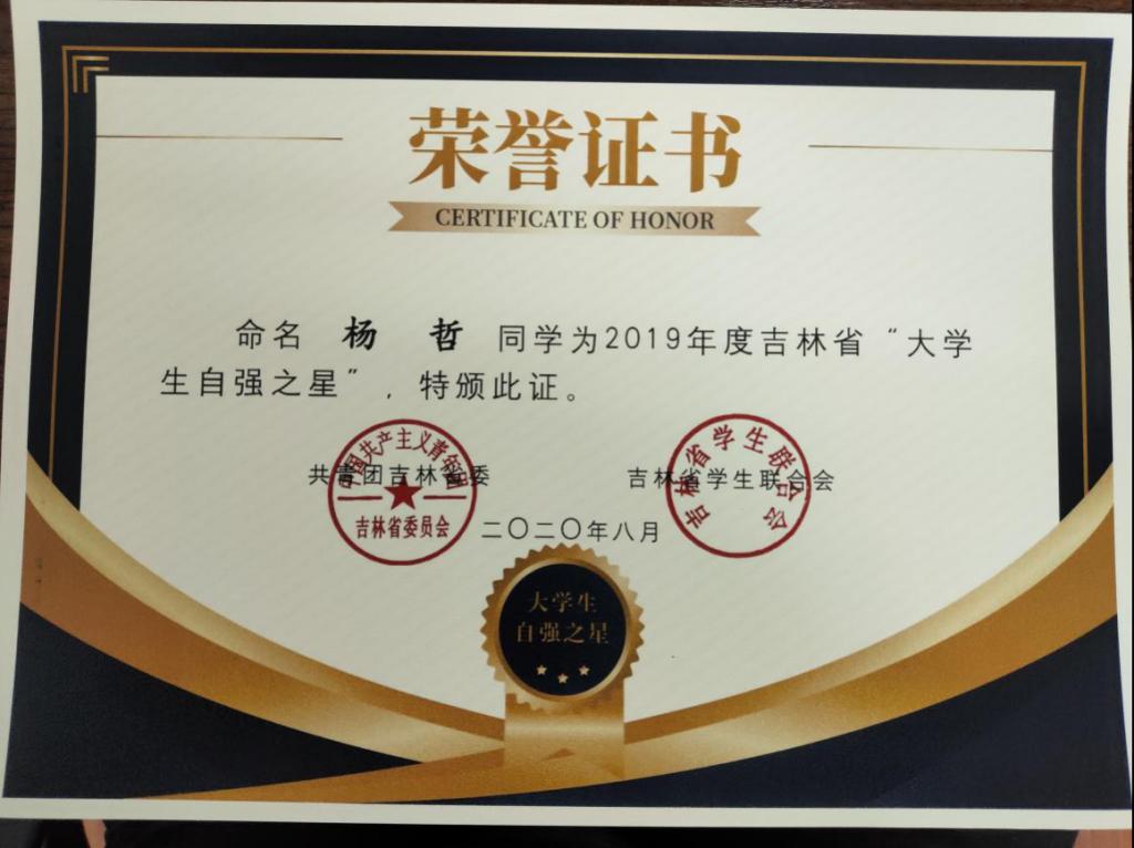 经学院推荐、校团委审核上报、团省委评审,我校东北亚高铁学院动车组检修技术1806班杨哲和城市轨道交通学院城轨车辆1801班孙秋实两名同学在吉林省众多大学生中脱颖而出,荣获2019年度吉林省百名“大学生自强之星”荣誉称号。为我校学生树立榜样引领作用的自强典型。