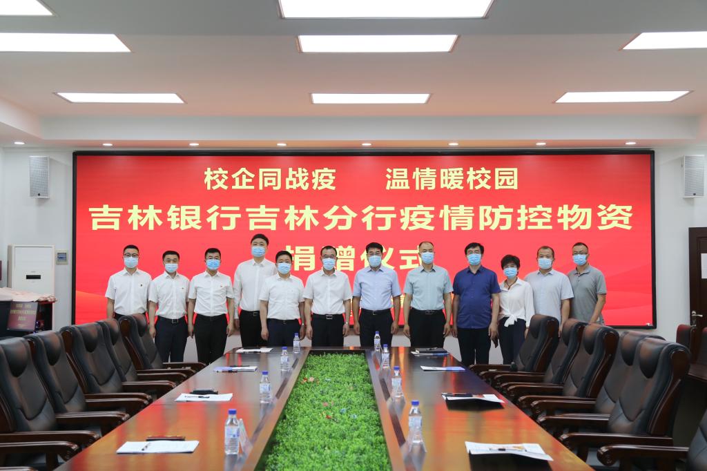 交流结束后,举行了物资捐赠仪式。曹炳志代表学校接受吉林银行吉林分行防控物资捐赠,胡越平代表学校向吉林银行吉林分行赠送了锦旗。