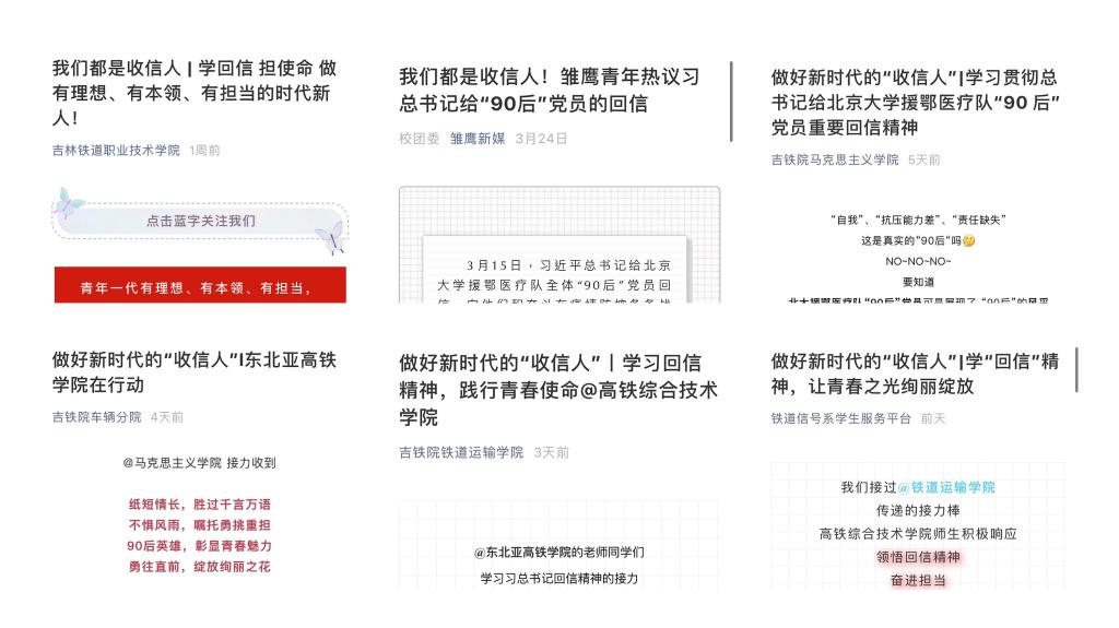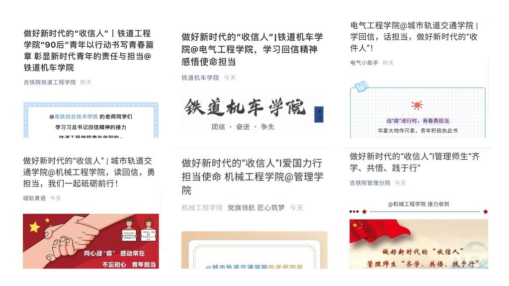 一封来信,赤子心肠;一封回信,饱含深情。师生们在认真学习了习近平总书记的回信后备受鼓舞,纷纷抒发爱国之情、报国之志,希望用实际行动践行新时代青年的责任与担当,彰显青春力量。学校官方微信平台发布了《我们都是收信人|学回信 担使命 做有理想、有本领、有担当的时代新人》推文,展示学习心得。校团委、各学院先后组织开展了各类学习活动,采取“说”、“唱”、“写”、“拍”、“画”形式,用大白话讲道理,用好作品营造好氛围,充分发挥学工干部、班主任等带头示范作用,通过云会议、线上主题党日等多种形式,分享学习心得,并依托本单位、部门的官方微博、微信等新媒体平台,全景展示师生学习交流情况,进行了一场校内学习“@大接龙”网络互动活动,累积发布微信推文11篇,形成了全校师生“同学习、齐分享、共实践”的生动局面。