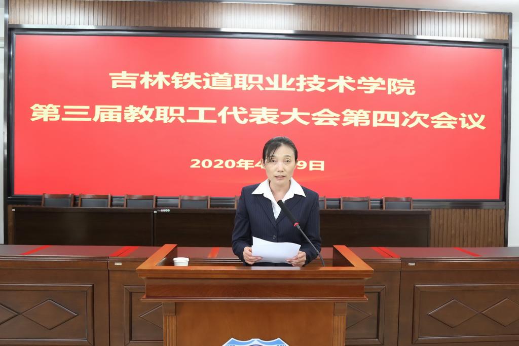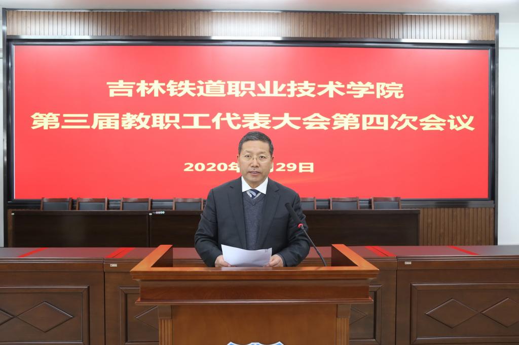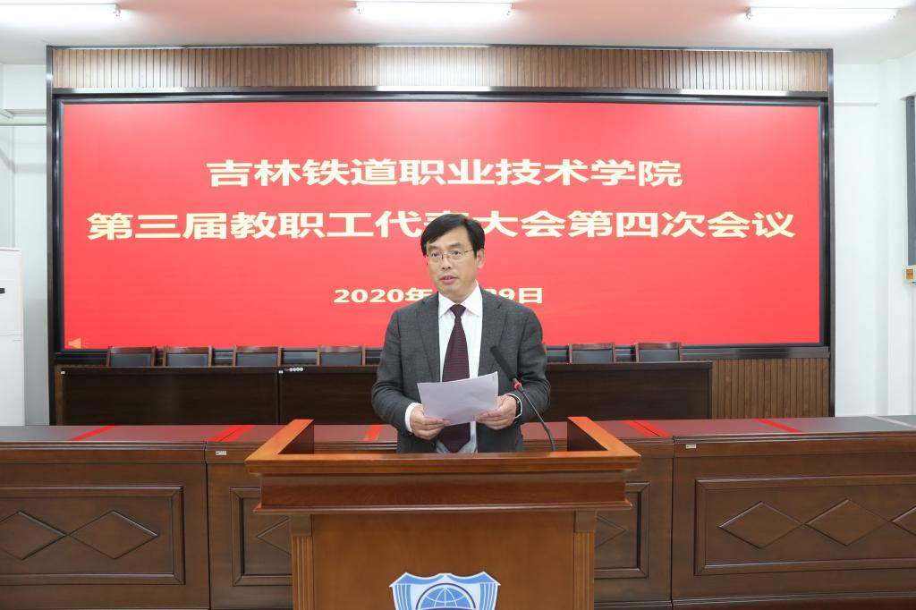 曹炳志所作的《报告》回顾了学校2019年在加强党的全面领导,政治领航卓有成效;落实立德树人根本任务,思想政治工作成效显著;探索创新学生工作机制,学生工作成绩斐然;提升教育教学质量,内涵建设取得突破;招生再创新纪录,就业工作持续向好;加强师资队伍建设,激发人才发展活力;全面深化产教融合,校企合作步伐加快;提升中外合作办学水平,国际交流合作日益深化;社会办学声誉远播,职教影响稳步扩大;做好培训继续教育,社会化办学繁荣发展;创建平安和谐校园,积极弘扬大学文化;加强精细化管理,治理能力不断提升;积极打造“幸福铁院”,增强师生获得感;强化责任担当,落实脱贫攻坚政治任务等十四个方面取得的可喜成绩。分析了学校新一轮振兴发展面临的新形势,部署了2020年学校的重点工作任务。《报告》强调,2020年是全面建成小康社会和“十三五”规划的收官之年,是中国特色高水平专业群建设的开局之年,我们在面临着大好形势的同时,要抢抓四大发展机遇:一是加快教育现代化建设带来的机遇;二是加快发展现代职业教育带来的机遇;三是加快发展具有吉林特色的现代职业教育带来的机遇;四是高铁和城市轨道交通行业快速发展带来的机遇。《报告》提出了2020年学校在提高政治站位,坚决打赢疫情防控阻击战;加强和完善党对学校工作的全面领导;以“双高计划”建设为中心,推进学校高质量发展;全面加强内涵建设,不断提高教育教学质量;坚持立德树人根本任务,提升学生教育、管理和服务水平;加大工作力度,切实做好招生与就业工作;深化产教融合与校企合作,强化培训和继续教育工作;加大力度,提升国际化办学水平;推进学校治理体系和治理能力现代化建设;全面创建平安稳定和谐校园;全面决战决胜脱贫攻坚;加强校园文化建设,打造“幸福铁院”;凝心聚力促发展,攻坚克难上台阶等十三大方面50项具体工作。同时,《报告》要求全校上下要以更加开拓进取的精神、更加奋发有为的姿态、更加务实肯干的作风,守初心、担使命、共奋进,奋力书写学校新时代新一轮振兴发展的崭新画卷。让我们凝心聚力,抢抓机遇,攻坚克难,共同创造、共同建设、共同迎接吉铁院光辉灿烂的美好明天!