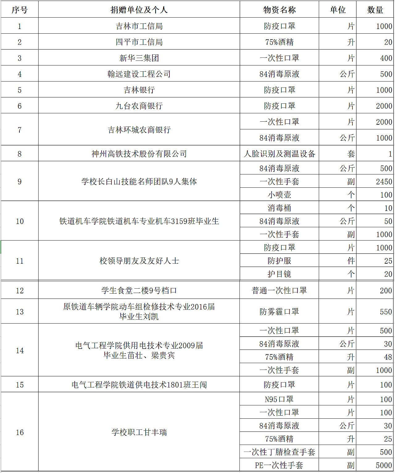 学校先后接收了吉林市工信局、四平市工信局、新华三集团、翰远建设工程公司、吉林银行、九台农商银行、吉林环城农商银行、神州高铁技术股份有限公司、学校长白山技能名师团队9人集体、铁道机车学院铁道机车专业机车3159班毕业生、校领导朋友及友好人士、学校学生食堂二楼9号档口、原铁道车辆学院动车组检修技术专业2016届毕业生刘凯、电气工程学院供用电技术专业2009届毕业生苗壮和梁贵宾、电气工程学院铁道供电技术1801班王闯、学校职工甘丰瑞捐赠的各类口罩、酒精、消毒原液、一次性手套等防疫物资。
