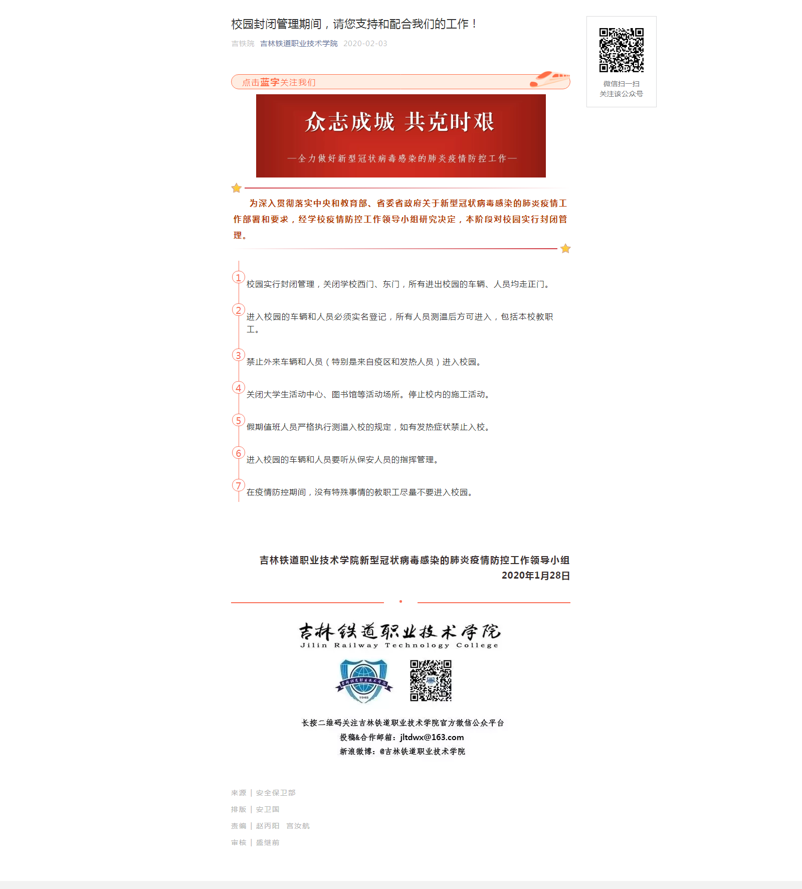 【抗击新冠肺炎 吉铁院在行动】校园封闭管理期间,请您支持和配合我们的工作!