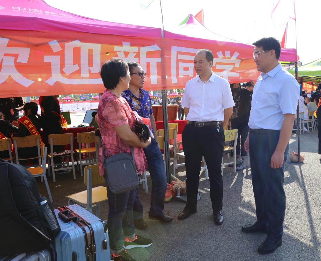 | 学校党委书记胡越平,党委副书记、校长曹炳志与新生家长交流 |