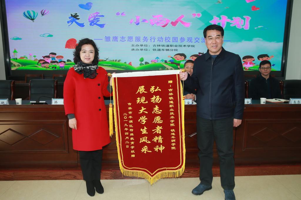 在交流会上,学院党委副书记徐彤宝致辞。在致辞中,他对丰满特殊教育学校师生和家长的到来表示热烈欢迎,并希望我校的学生能够在丰满特殊教育学校这个社会实践平台上,进一步做好关心关爱自闭症儿童的志愿服务,在互帮互助、相互陪伴中共同成长。随后,丰满区特殊教育学校党支部书记、校长韩颖代表丰满区特殊教育学校对铁道车辆分院的志愿服务表示感谢,并向学院赠送了锦旗。丰满区特殊教育学校主任唐吉焱宣读感谢信。最后,学院党委书记胡越平代表学院向丰满区特殊教育学校赠送了礼物。