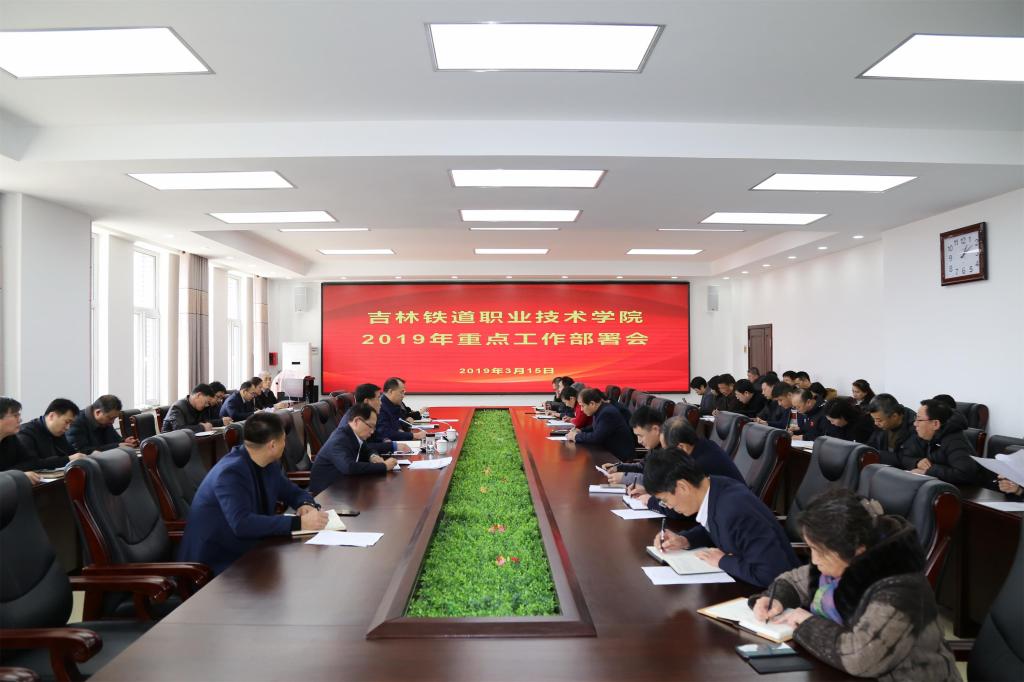 会上,学院党委副书记、院长曹炳志同志讲话。曹炳志院长在讲话中,分析了学院发展面临的新形势,提出了2019年学院工作的总体要求,部署了12个方面、50项具体工作。重点工作任务是,坚持和加强党对学院全面工作的领导;坚持立德树人根本任务,培养新时代“两职两高”人才和“吉铁院特质”学生;全面加强内涵建设,不断提高教育教学质量;全力落实《国家职业教育改革实施方案》;着力打造过硬师资队伍,持续实现三个提升;全力做好招生与就业工作;深化产教融合、校企合作,为做好职业培训创造条件;提升国际化办学水平;提升学院现代化管理水平,确保“精准育人、职业培训”的实现;创建平安和谐校园;坚决打好脱贫攻坚战;加强校园文化建设,打造“幸福铁院”。