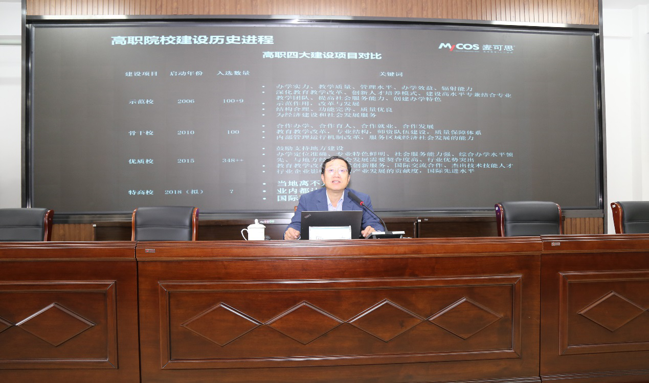 学院于2018年12月11日举办了国家“特高”计划和高职院校“50强”的专家报告会。麦可思副总裁、资深专家陈永红先生做了专题报告。学院党委书记胡越平、院长曹炳志、党委副书记徐彤宝、纪委书记苏春年、副院长李欣出席报告会,全院中层干部参加了报告会,会议由质量监控处处长王学明主持。