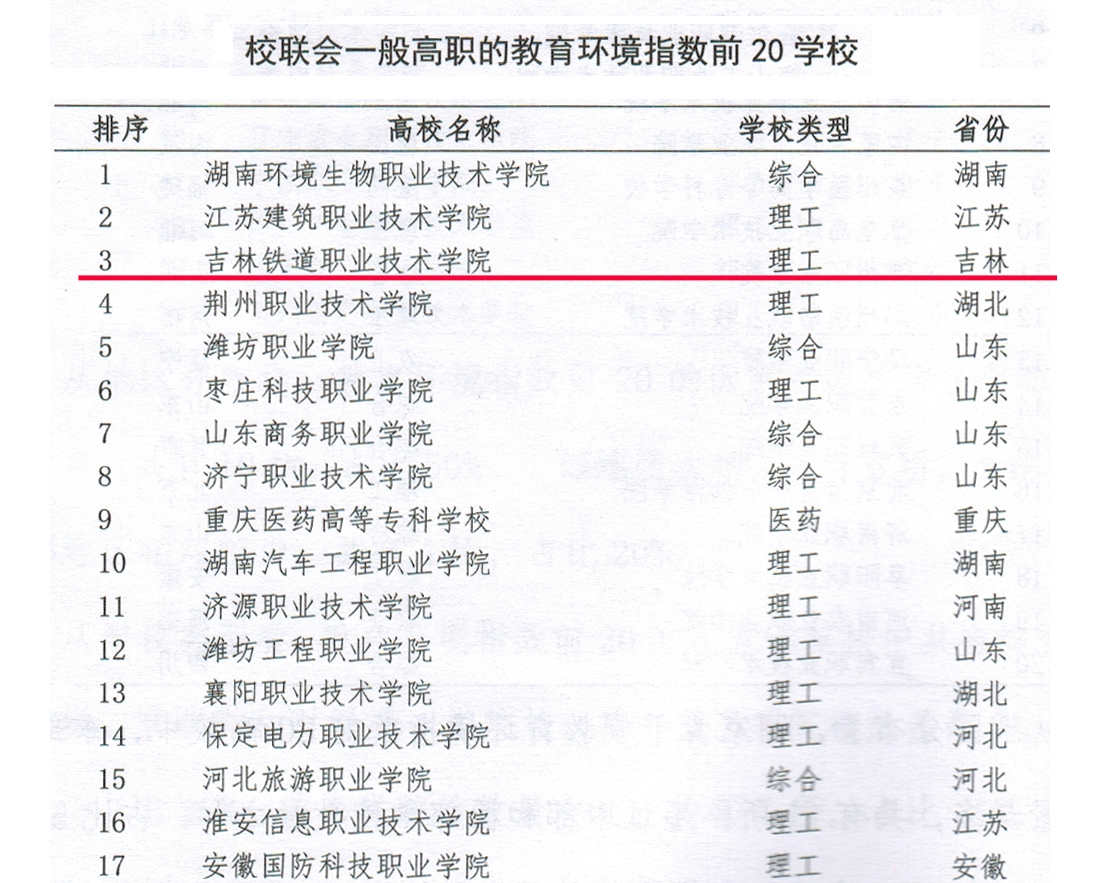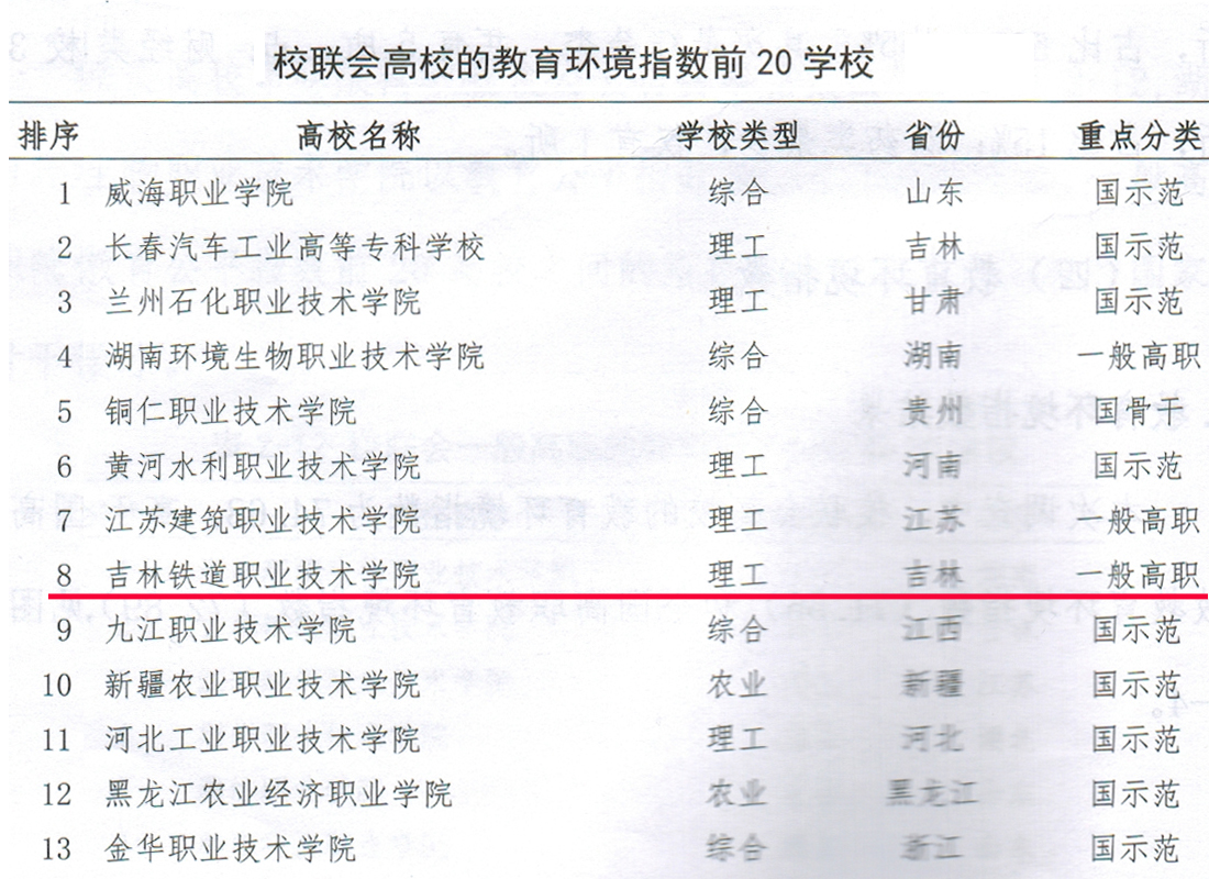 ⑥校联会高校教育环境指数 吉林铁道职业技术学院名列第八