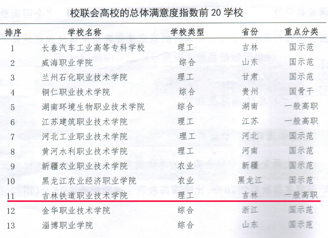 | ①校联会高校总体满意度指数 吉林铁道职业技术学院名列第十一