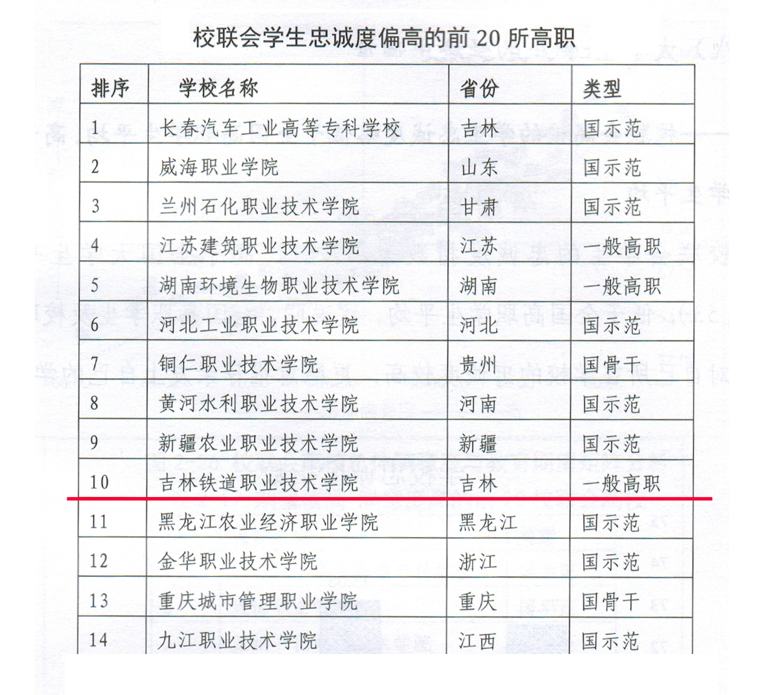⑨校联会学生忠诚度偏高的前20所高职 吉林铁道职业技术学院名列第十