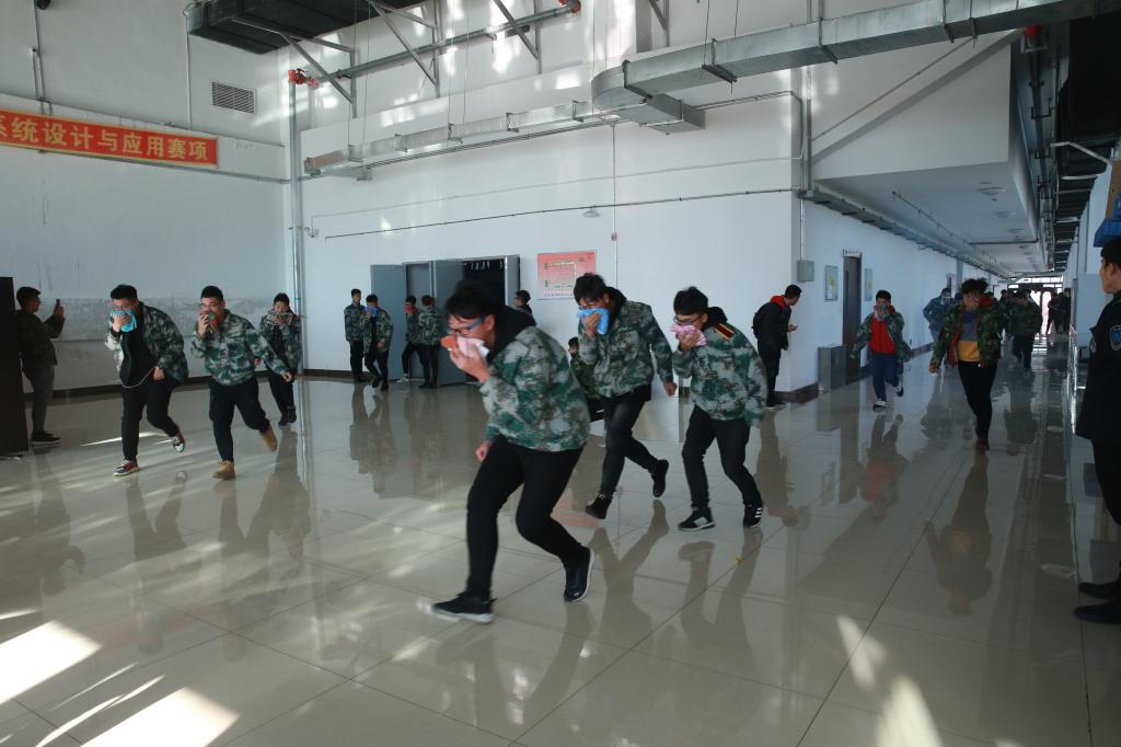 13:30,演练总指挥、副院长田雷宣布演练活动开始,演练模拟大学生活动中心一楼舞台电气线路发生火灾,体育教学部人员第一时间发现火情,马上启动消防应急广播系统拉响警报,并启动应急预案,听到警报后,大学生活动中心内的学生立即在老师和学生干部的组织下,按照疏散顺序和疏散路线从各个疏散通道迅速逃生,整个疏散过程约五分钟。